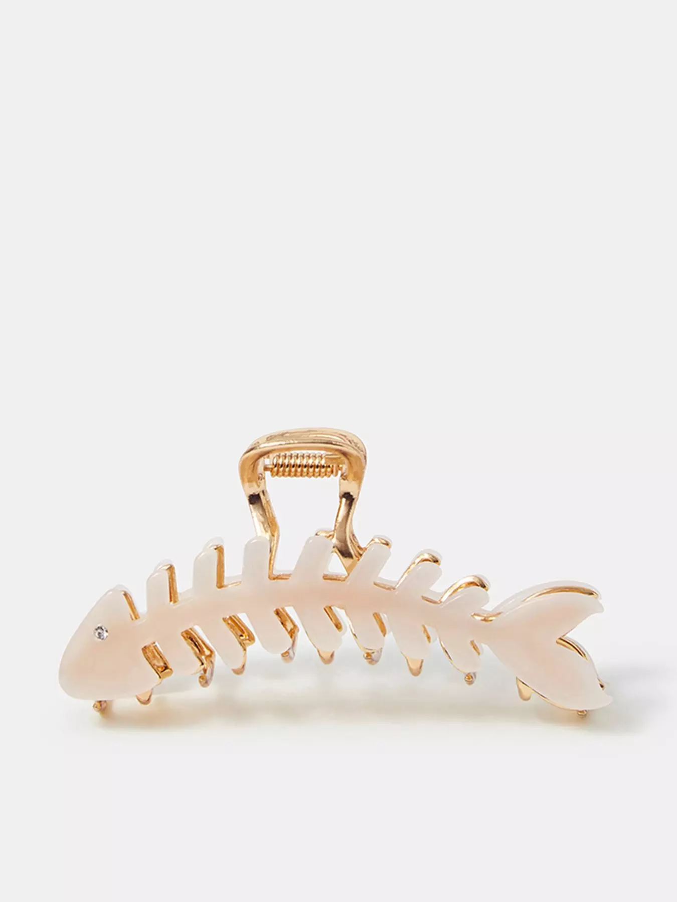 Serving island girl vibes on your daily commute, this claw clip is designed with a standout resin fish bone on gold hardware. Talk about a good catch!- Material Content: Composite: Acrylic 50% , Alloy 50%