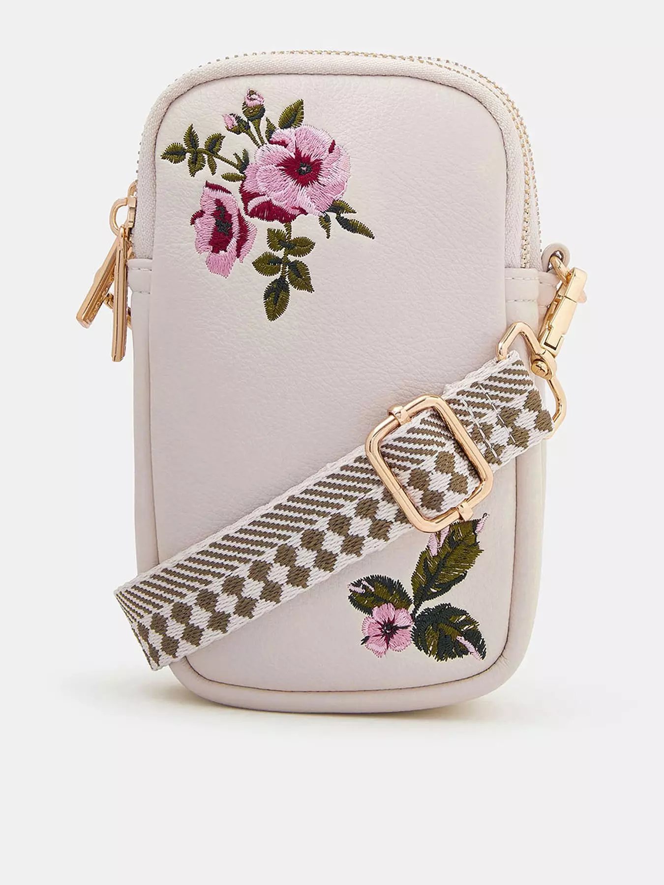 Lessening the load for your shoulder just got easier. Designed in faux leather with embroidered blooms, this bag features two zip compartments for storing your phone, keys and other essentials while you're out and about.A customisable style: this bag has a removable strap, meaning you can change up the design...every day of the week! From understated neutrals to punchy prints, why not take a look at our curated bag straps?