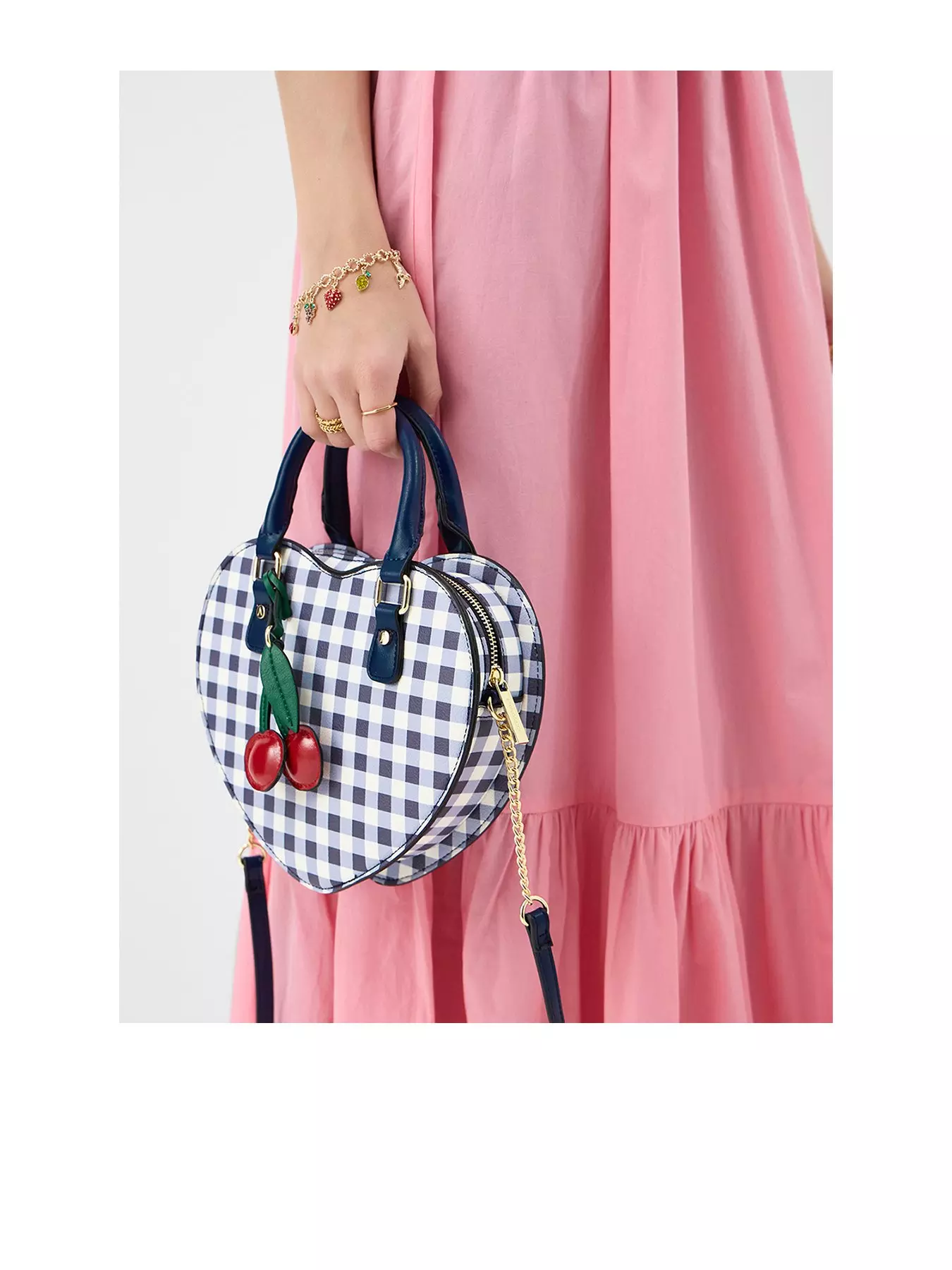 Shaped like a heart and patterned with gingham, this bag puts a fun, retro spin on every outfit. Features a crossbody strap, two top handles, zip fastening and cherry charm.- Material Content: Outer: Polyurethane (PU) 100% Lining: Polyester (Recycled) 100%