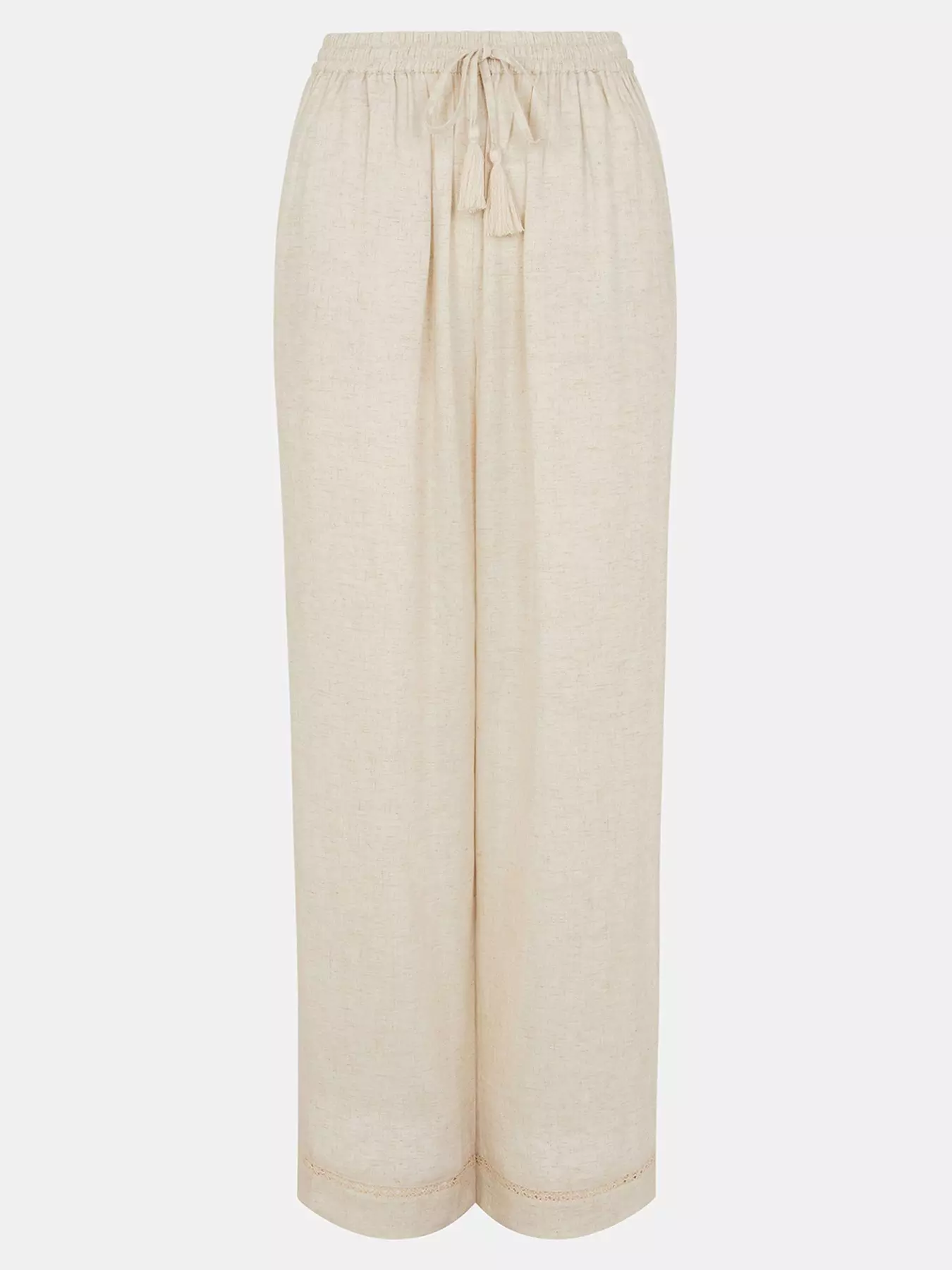The perfect pair for slipping on over swimwear after a day of tanning. These comfy wide leg trousers are designed in a lightweight linen and viscose blend, with a stretchy drawstring waistband and lace panel cuffs to finish.- Material Content: Composite: Linen (Flax) 20% , Viscose 80%