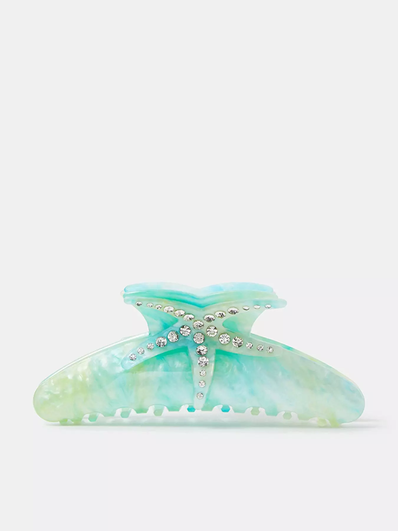 An essential for your next holiday, because accessorising is important. Designed in turquoise resin to match tropical ocean water, this claw clip features a bedazzled star fish design on both sides.- Material Content: Composite: Acrylic 70% , Glass 20% , Iron 10%