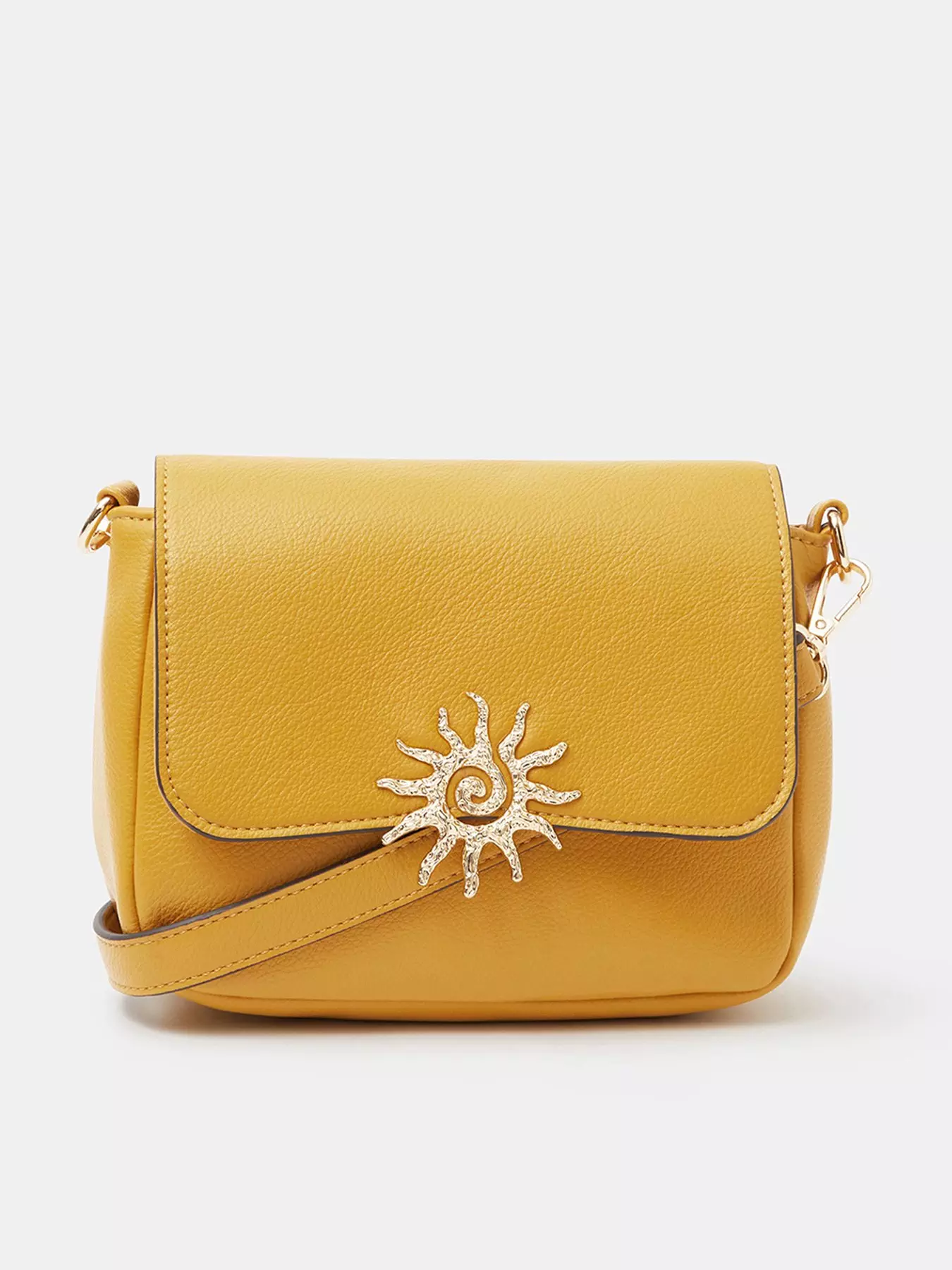 Soaked in a golden orange-yellow hue, this faux leather bag *screams* summer. Designed with an abstract sun motif at the centre, it features a zipped pocket in the main compartment and a long crossbody strap. So, now you've got the accessories, when's the trip?- Material Content: Outer: Polyurethane (PU) 100% Lining: Polyester (Recycled) 100%