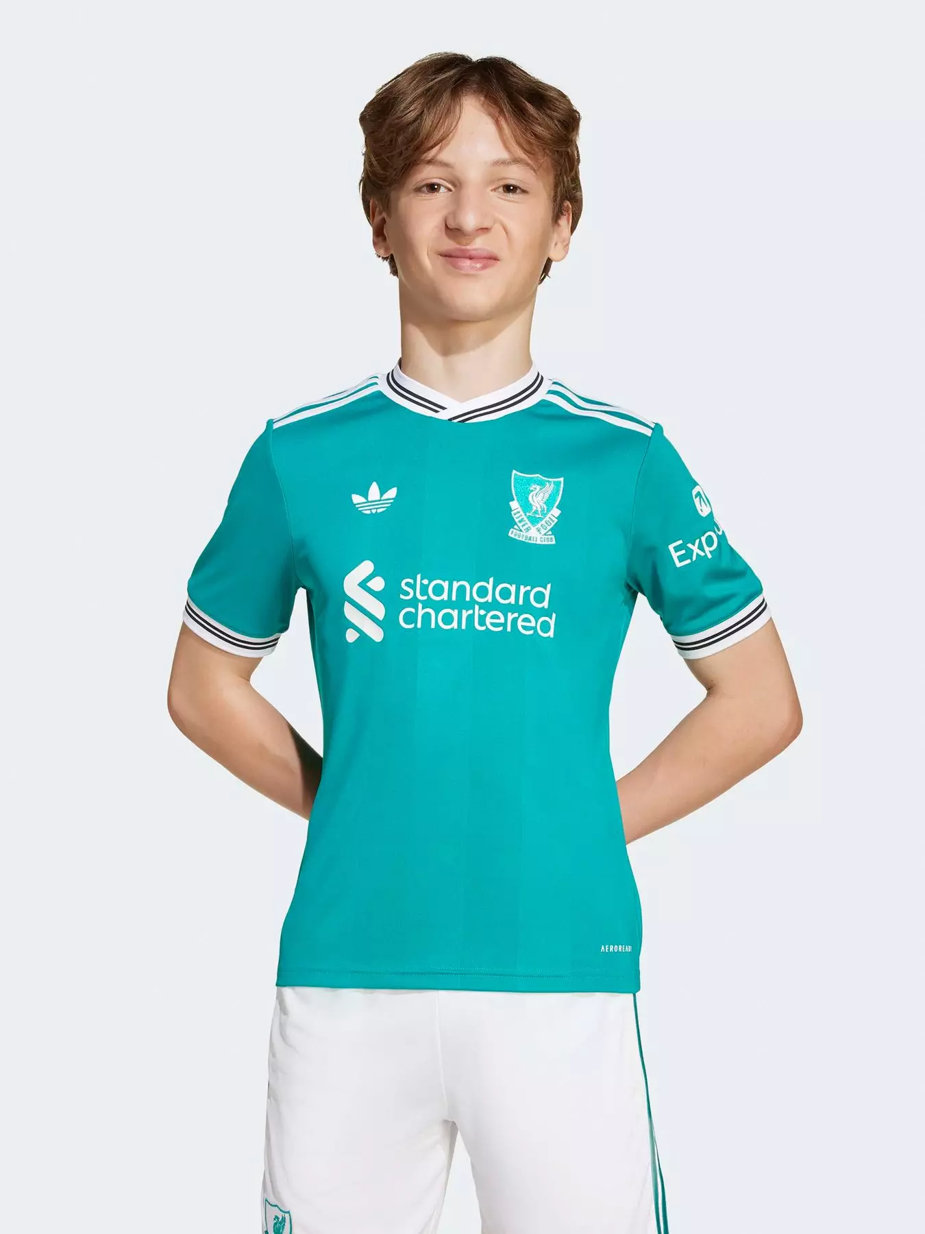 A modern football classic inspired by Liverpool FCs storied 3-Stripes history. The tonal vertical stripes on this juniors third jersey come in unmistakable adidas Equipment green. On the chest, that vintage club badge shares the spotlight with a Trefoil for the first time since 1991. Created for travelling Reds, this shirt includes moisture-managing AEROREADY so it feels as good as it looks.About the brand: