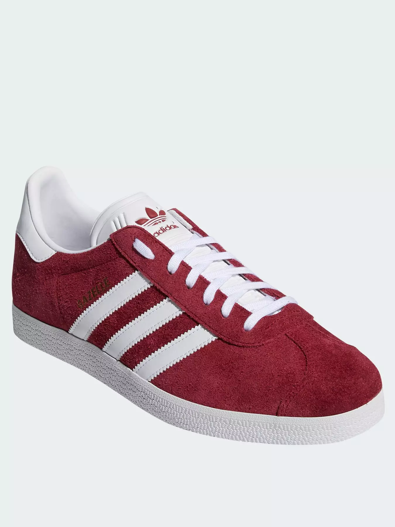 - Vintage appeal and athletic ethics are what make the adidas Originals Gazelle a true classic. They return in burgundy suede with a contrast leather tongue that builds upon street get-up. The crisp outsole, lace fastening and leather heel collar stays true to simple.