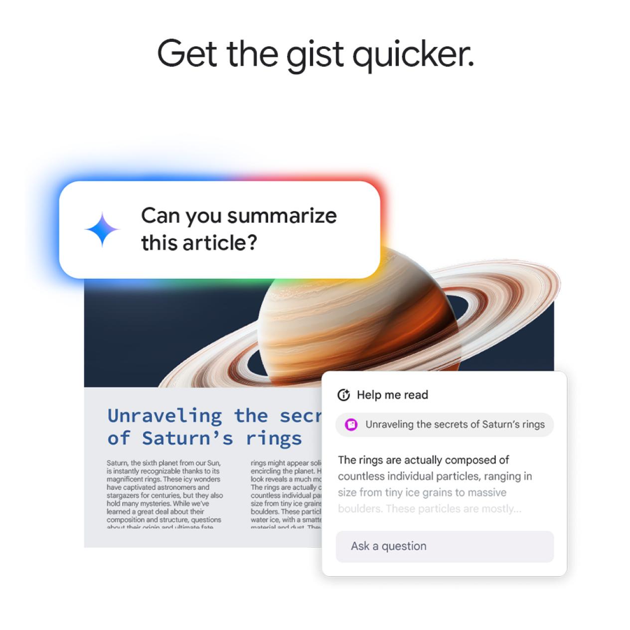 Summarise information, explain concepts, and highlight key points. Gemini makes it easier to explore topics and get projects moving quickly.