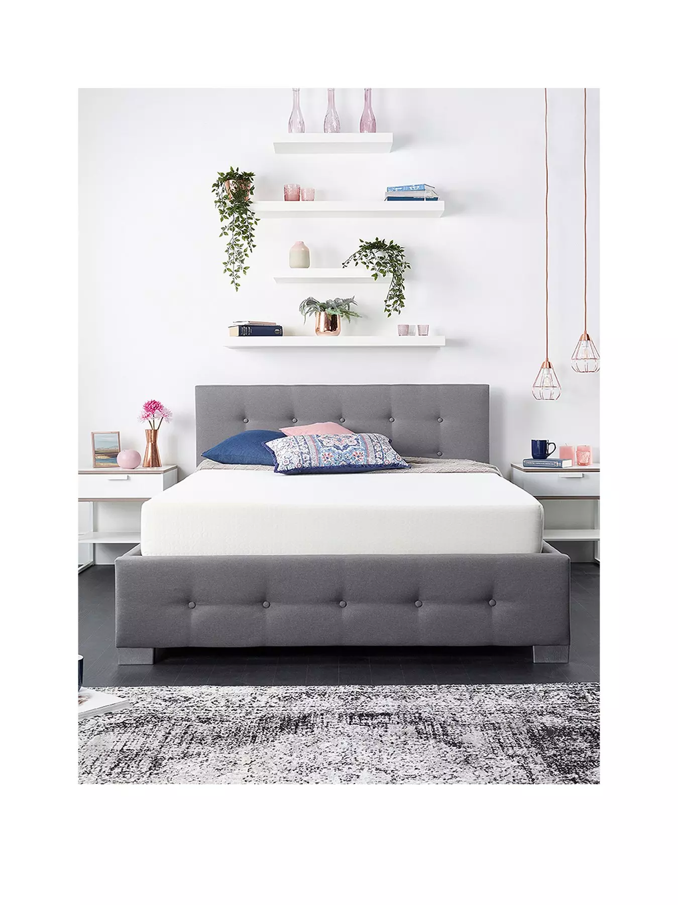 This storage ottoman bed by Aspire has a classic buttoned finish to the headboard and footboard. The padded headboard provides added comfort when sitting up in bed, and the whole thing is wrapped in a quality linen fabric.It comes in a soft grey shade you can match with all kinds of decors and bedding designs, and the mattress base can be manually lifted with the help of the hydraulic pistons to reveal a roomy ottoman storage area that's perfect for spare bedding and pillows.