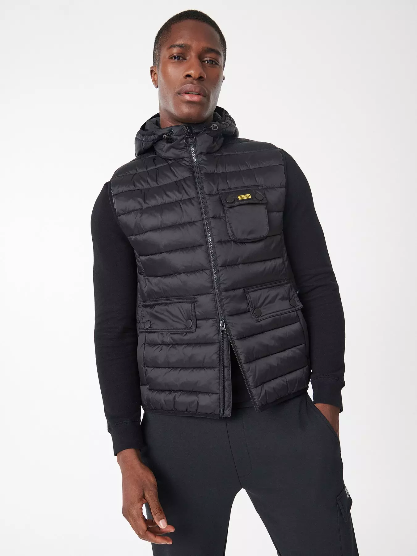 The Barbour International Ousten Hooded Gilet is a sporty piece with a baffle-quilted outer, a fixed hood and Lycra binding at the hem and armholes for easy movement. The iconic angled chest pocket first seen on the biker jackets of the 1950s is trimmed with the inimitable black and yellow logo.Material & Care
