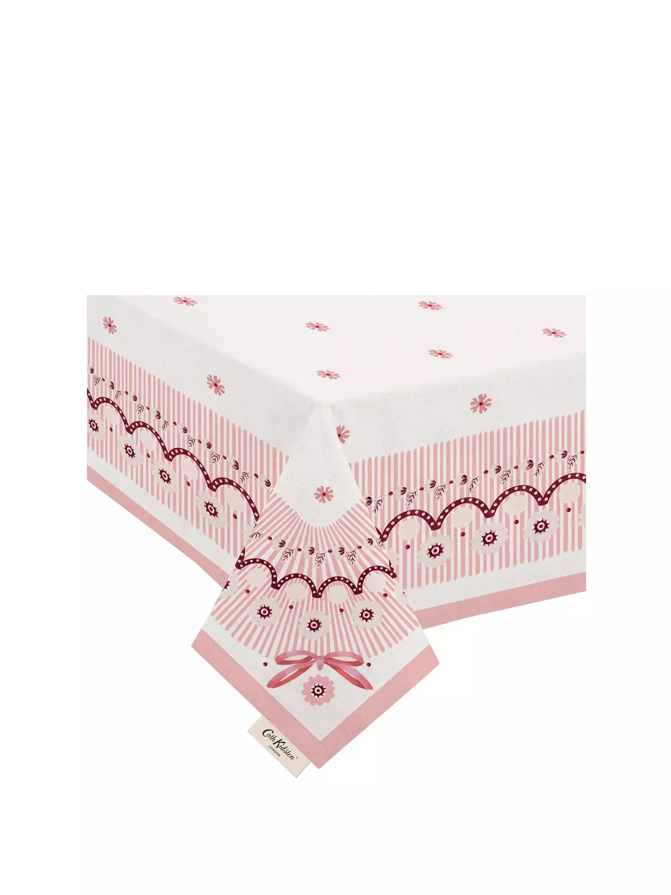Set the scene beautifully with the Spitalfields Silk Tablecloth. Featuring a minimal pink floral repeat design and a pink striped border that complements the dinnerware range, it coordinates perfectly with the collection?s kitchen textiles.- Depth: .3 CM