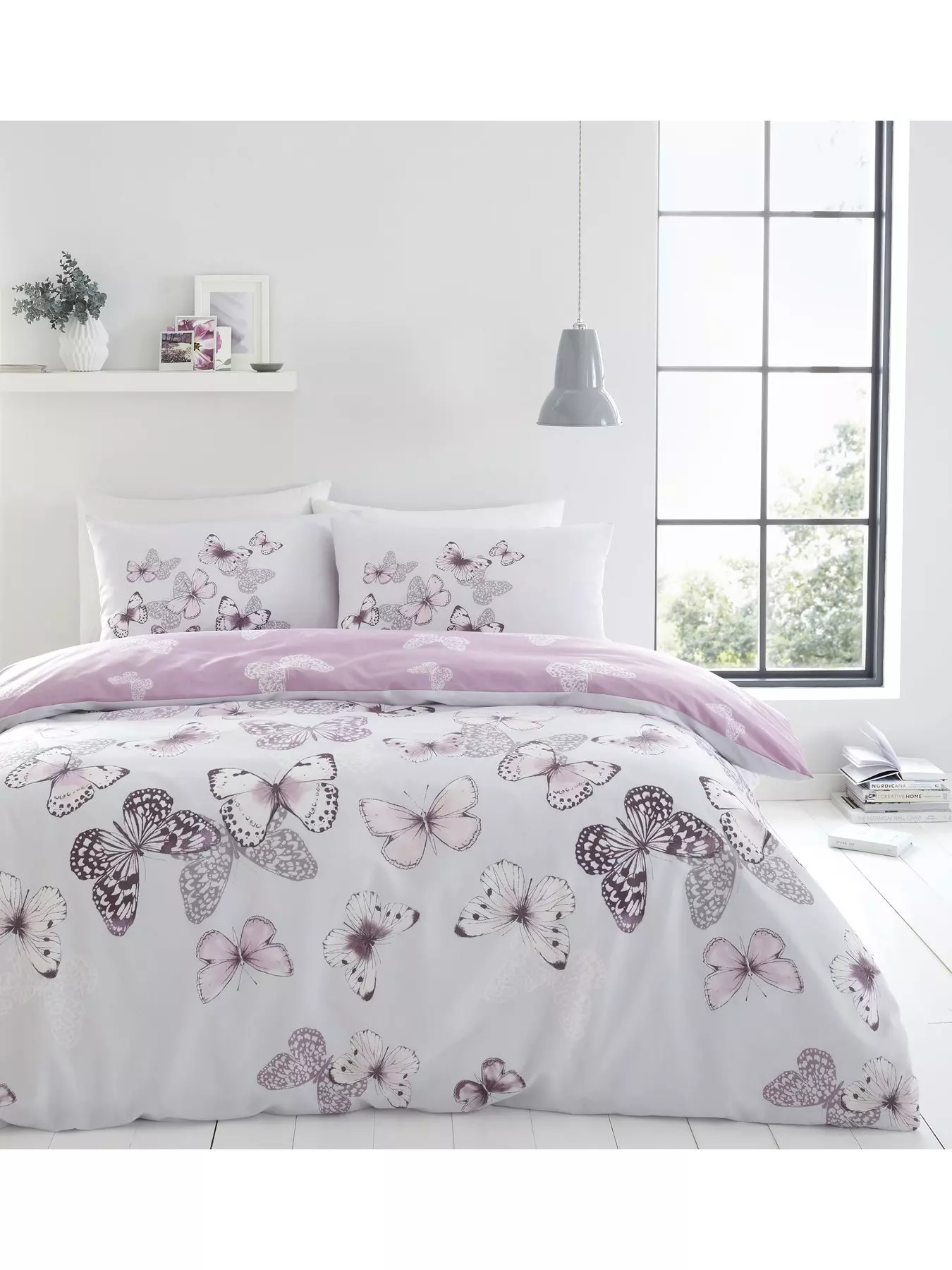 Full of delicate charm, the beautiful Butterfly duvet cover and pillowcase set by Catherine Lansfield is perfect for brightening up your sleep space.The cotton-rich fabric sees a pale grey canvas playing host to a series of fluttering butterflies in muted shades of heather. Intricate details in the wings create a soothing visual, while the fully reversible design allows for styling versatility. Just flip your duvet to reveal a contrasting print featuring silhouettes of even more butterflies against a soft purple backdrop.