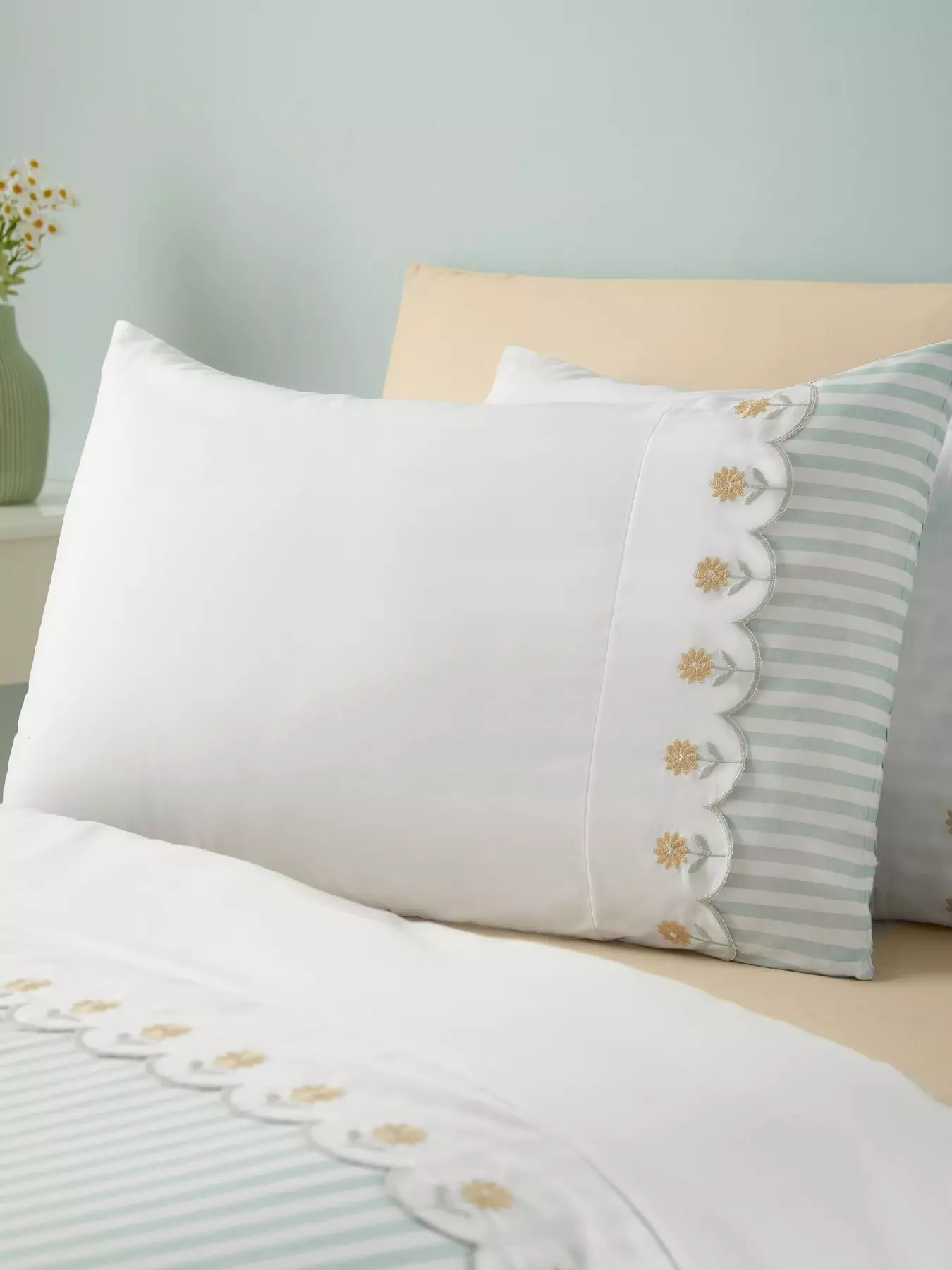 Catherine Lansfield is renowned for style and quality - designed and developed in Great Britain.Delight in the gentle charm of this embroidered daisy bedding set, where delicate details meet cottagecore dreams. Featuring soft green pinstripes and scalloped edging, the design is beautifully finished with embroidered daisies for a touch of modern country flair. Easy care and quick to dry, this microfibre set is a time-saving and hassle-free bedding option.