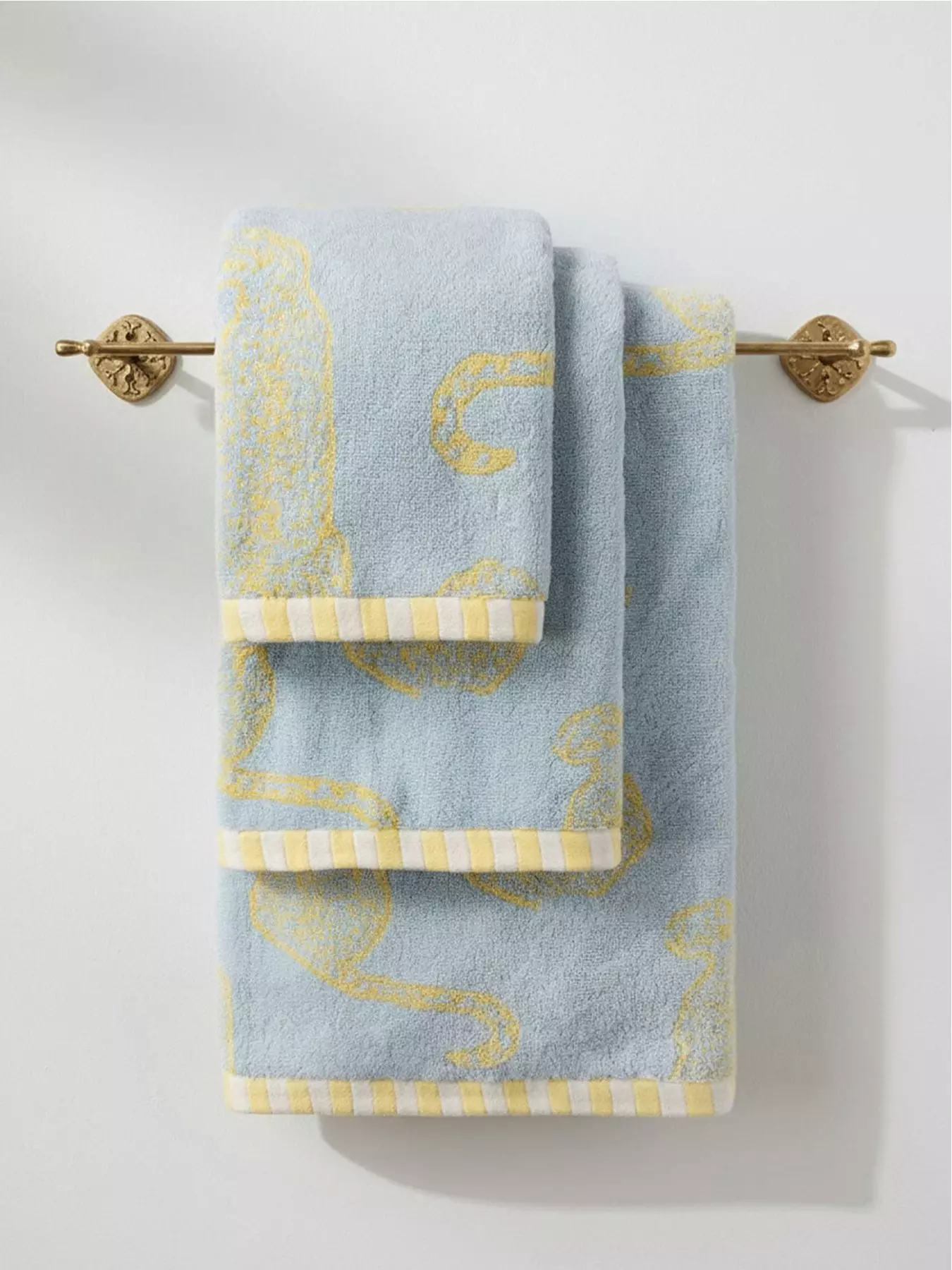 Wrap yourself in sun-ready style with our Resting Leopard Print Towel. One side showcases subtle blue leopards set against a mellow yellow background, creating a playful Print that feels positive and fun. Flip it over to reveal the reverse colourway; a sky-blue background dotted with calming yellow leopards, for a gentle twist. Finished with green and white striped edging for a touch of contemporary flair.Crafted from soft, absorbent 100% cotton, this towel combines practicality with style, bringing a touch of playful luxury to your everyday routine.