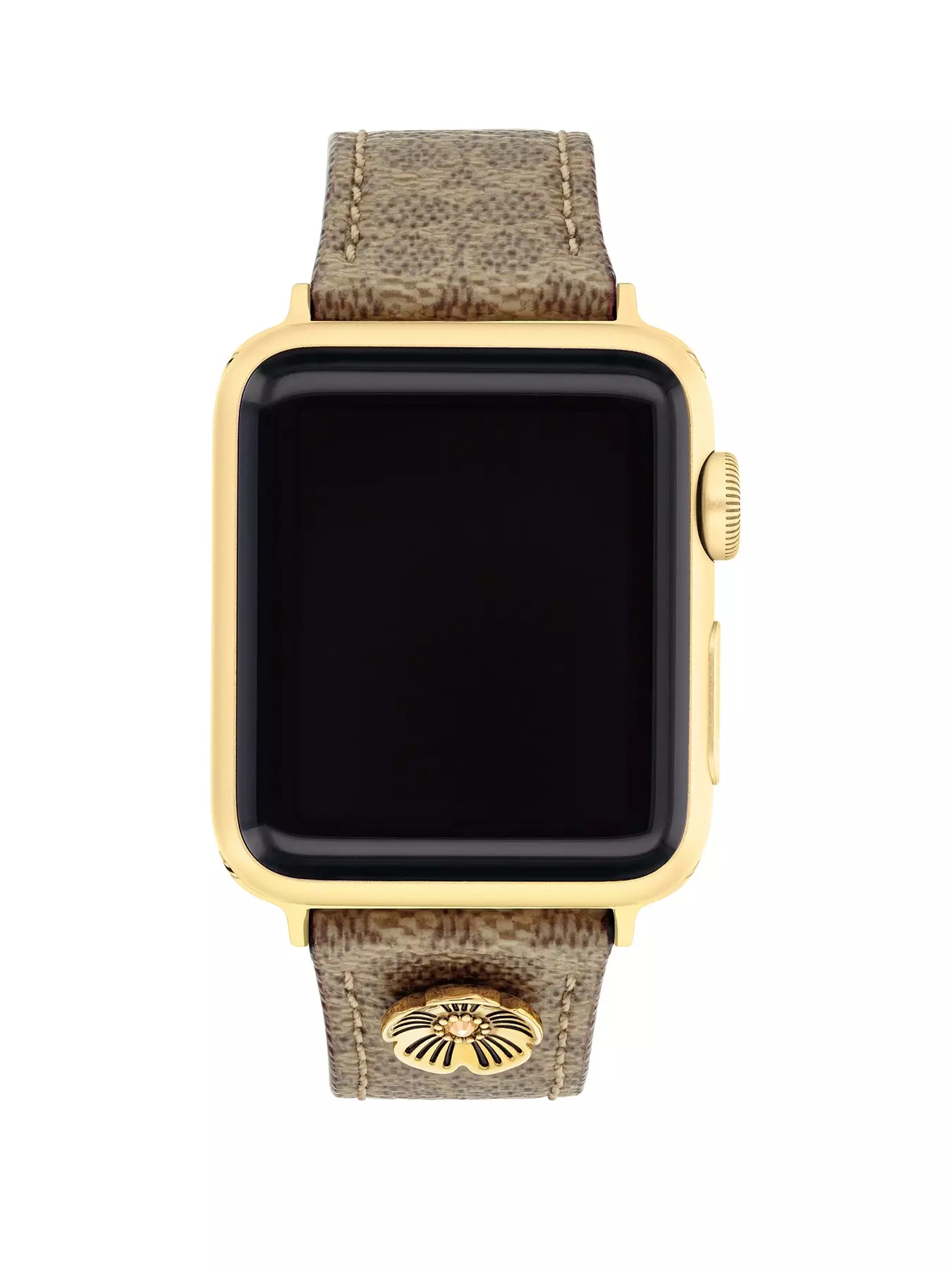Made exclusively for use with the 38mm, 40mm and 41mm Apple Watch, this tan Coach Signature canvas strap secures with gold tone hardware and is detailed with the Coach Tea Rose charm.About the brand:
