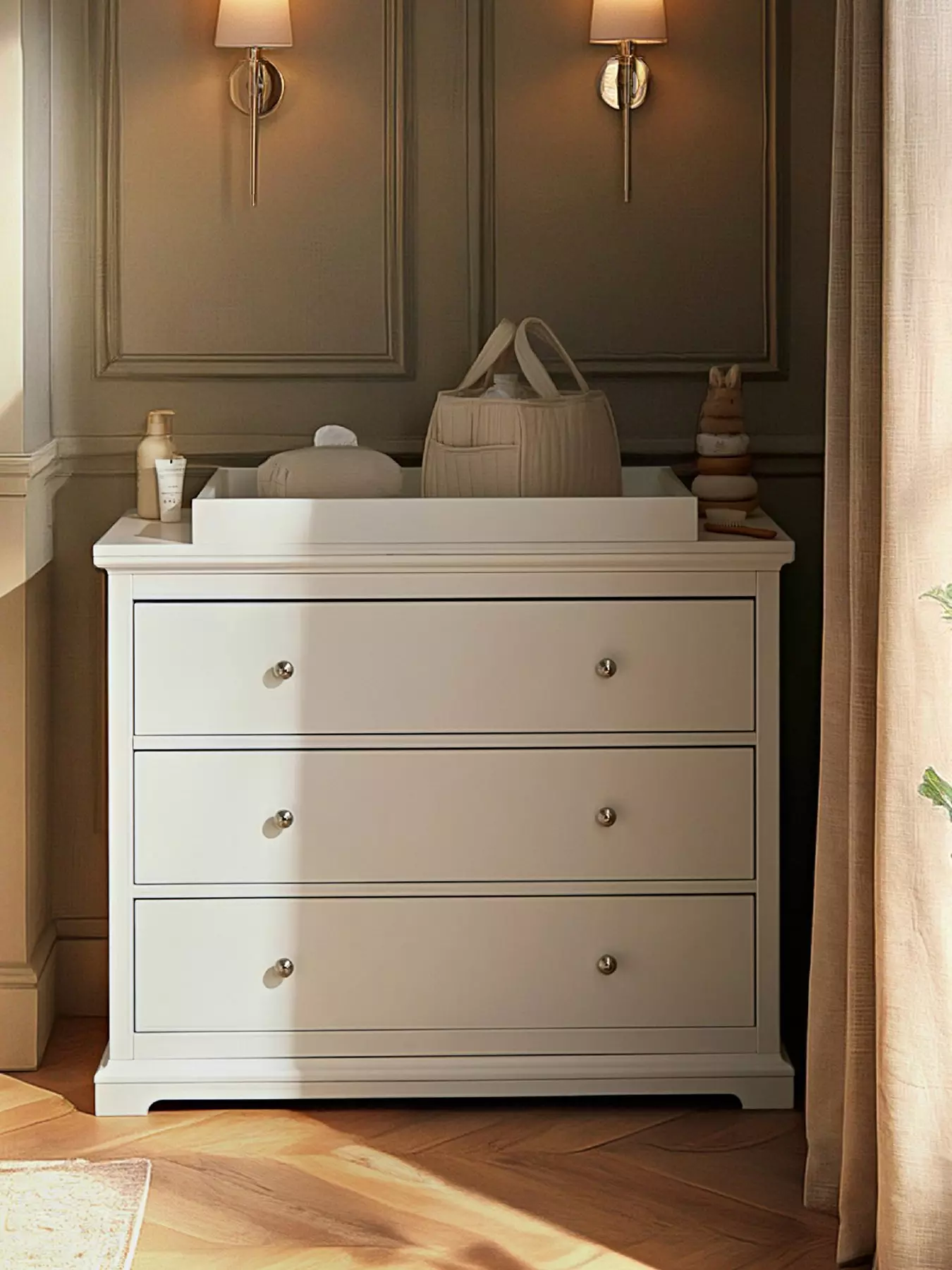 Designed to support everyday routines from the very beginning, the CuddleCo Beaumont Dresser Changer brings together refined detailing and practical, long-lasting functionality. The removable changing top creates a secure and comfortable space for nappy changes during the early months, then lifts away to transform the piece into a classic dresser designed to last for years to come.Three spacious drawers offer generous storage for changing and dressing essentials, helping to keep the nursery organised, calm and easy to navigate. Smooth-glide drawer runners with soft-close detailing allow for quiet, fuss-free access, supporting busy days and quieter nights.