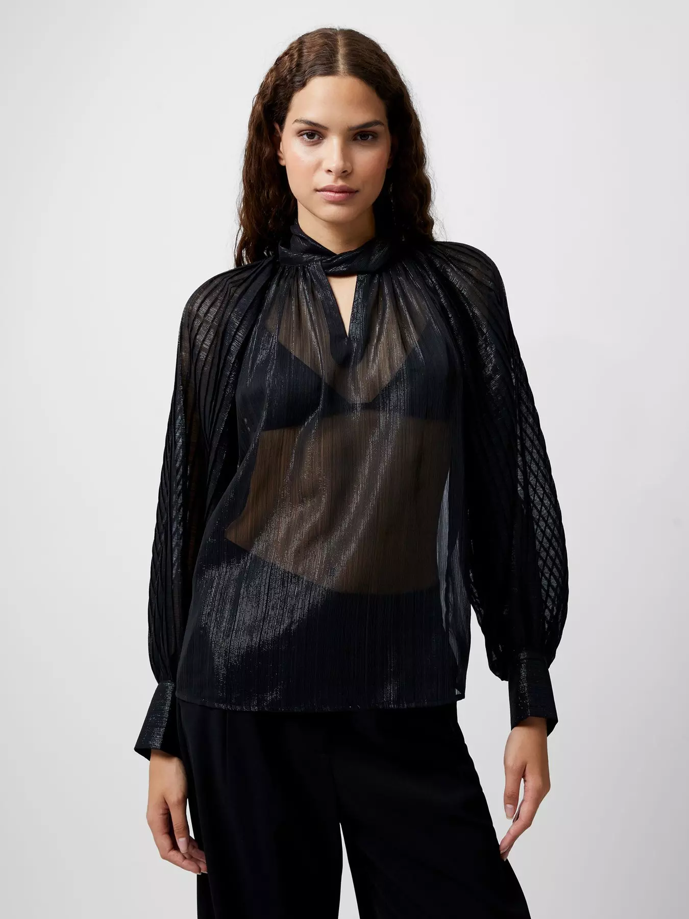 The Beth Lurex Keyhole Top from French Connection adds a touch of sheer volume and glamour to your wardrobe. This eye-catching top features metallic lurex stripes on a lightweight, sheer body. It's introduced by a twist-detailed neckline and a keyhole cutout, all framed by vivacious oversized balloon sleeves. Perfect for adding a sparkling, dynamic element to your outfit.- Material Content: 100% Polyester