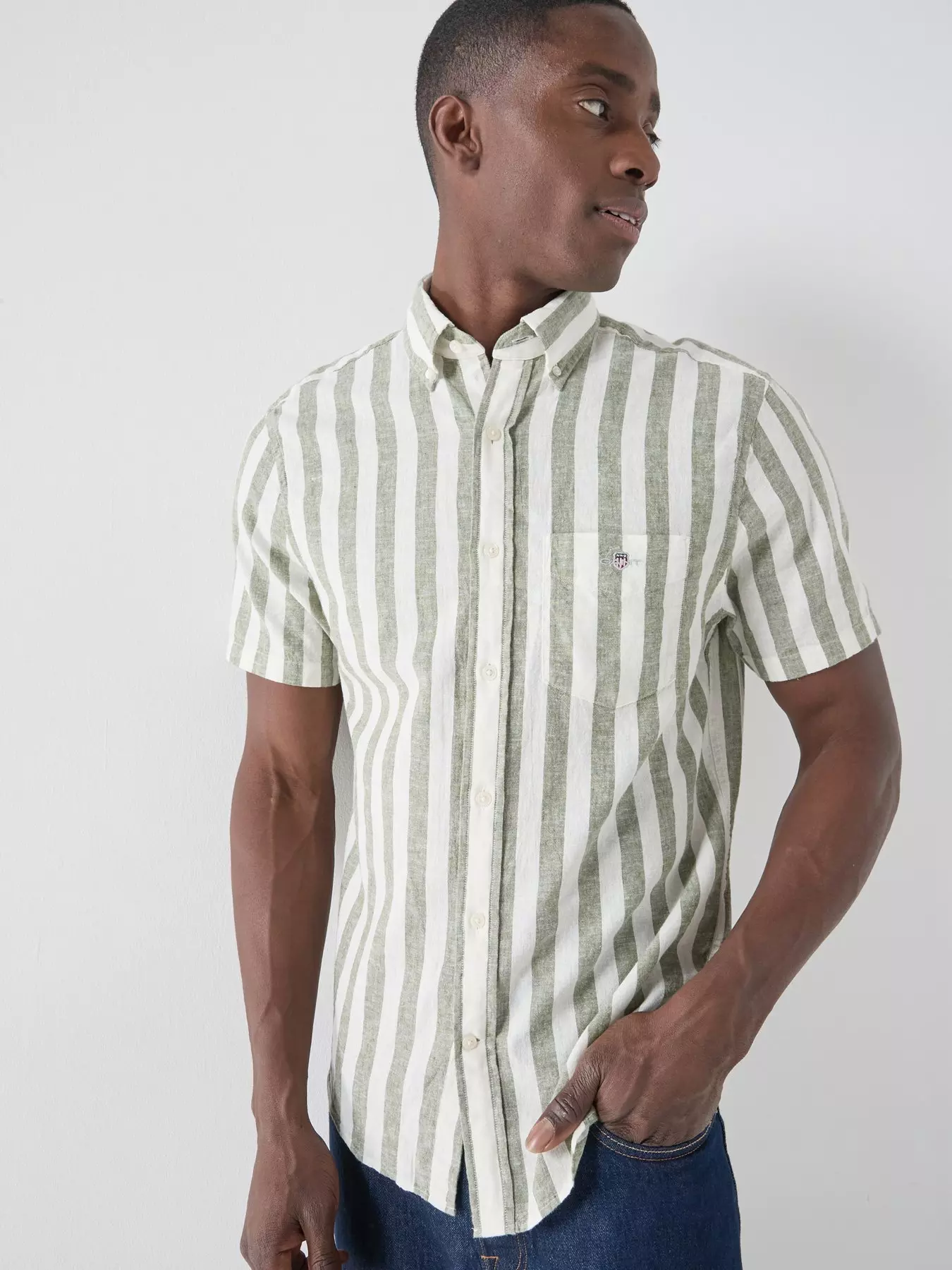 - Regular Fit Cotton Linen Blend Striped Short Sleeve Shirt by GANT