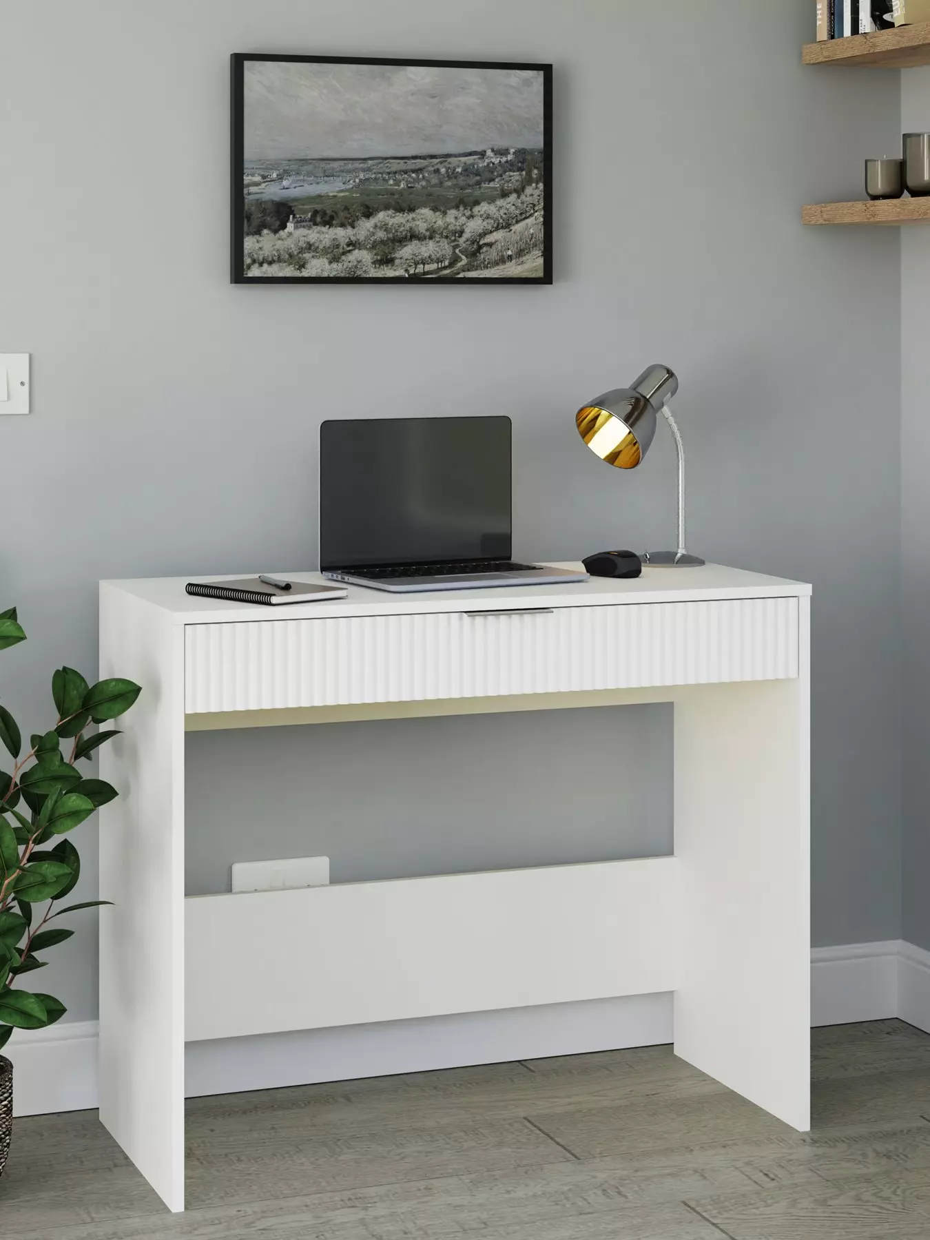 Elevate your living space with the GFW dressing table, expertly crafted to blend clean lines with a minimalist aesthetic. This table boasts a spacious drawer that slides effortlessly on metal runners, perfect for keeping your essentials neatly organized. The sleek, handleless design and refined black finish ensure a modern look that complements any interior. Constructed from high-quality particle board and MDF, finished with paper foil and melamine, this piece is designed for both durability and elegance. Discover the GFW Collection, featuring a range of matching furniture to create a cohesive and stylish environment. Whether you're using it as a vanity or a chic workspace, the GFW dressing table is the ideal choice for those who value both function and fashion. Experience the perfect blend of practicality and style with GFW. Available in Black and White- Assembly: Self Assembly