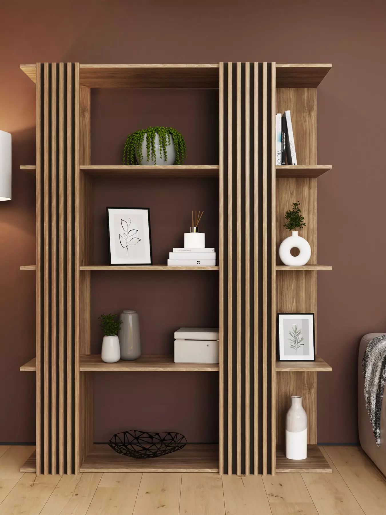 Inspired by the modern wall panelling trend, this Rowen bookshelf by GFW is ideal for showing off all your favourite novels, ornaments, pictures and so much more. In oak-effect, the off-setting shelves create views from different angles, while the slats are separated by black for an eye-catching contemporary look.Please remember to measure your available space before ordering.