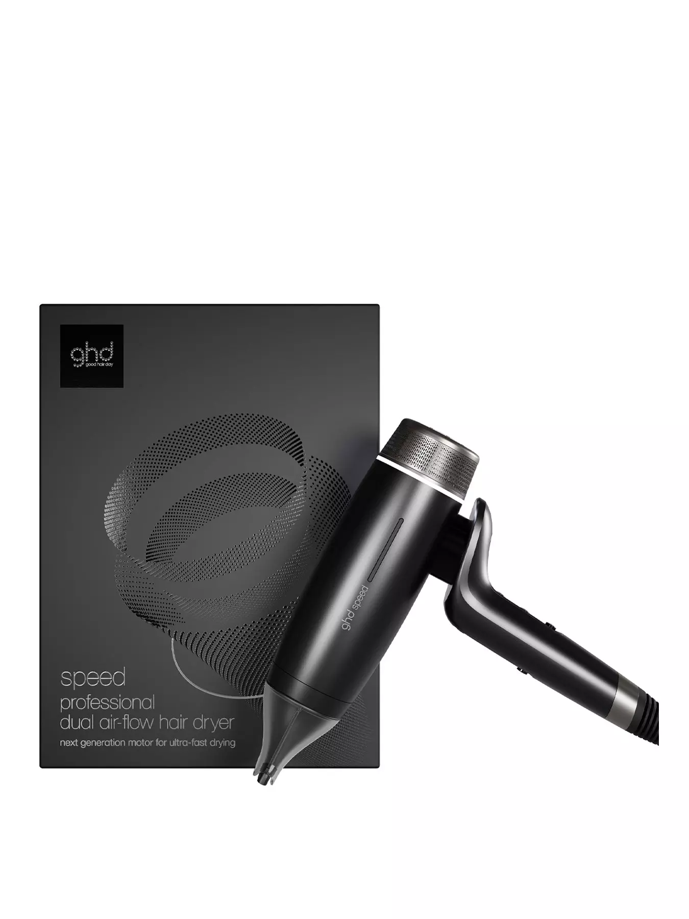 Experience a new era of blow drying with the ghd Speed hair dryer in black - our ultra-fast hair dryer. Featuring breakthrough ghd haloTM dual-airflow technology, uniting power with control for cool-scalp and cool-touch with no heat damage¹.Transform your styling routine with ultra-fast drying and flawless salon-worthy results. Powered by our fastest next-generation motor, ghd Speed produces a high-pressure airflow, drying hair quickly from root to tip with the perfect balance of speed and power with control. Developed by our engineers in collaboration with ghd professional stylists, over 4000 consumers were involved in the testing and development of ghd Speed. Engineered to deliver ultra-fast drying - our experts put hundreds of hair dryers to the test, and not one was faster than ghd Speed.