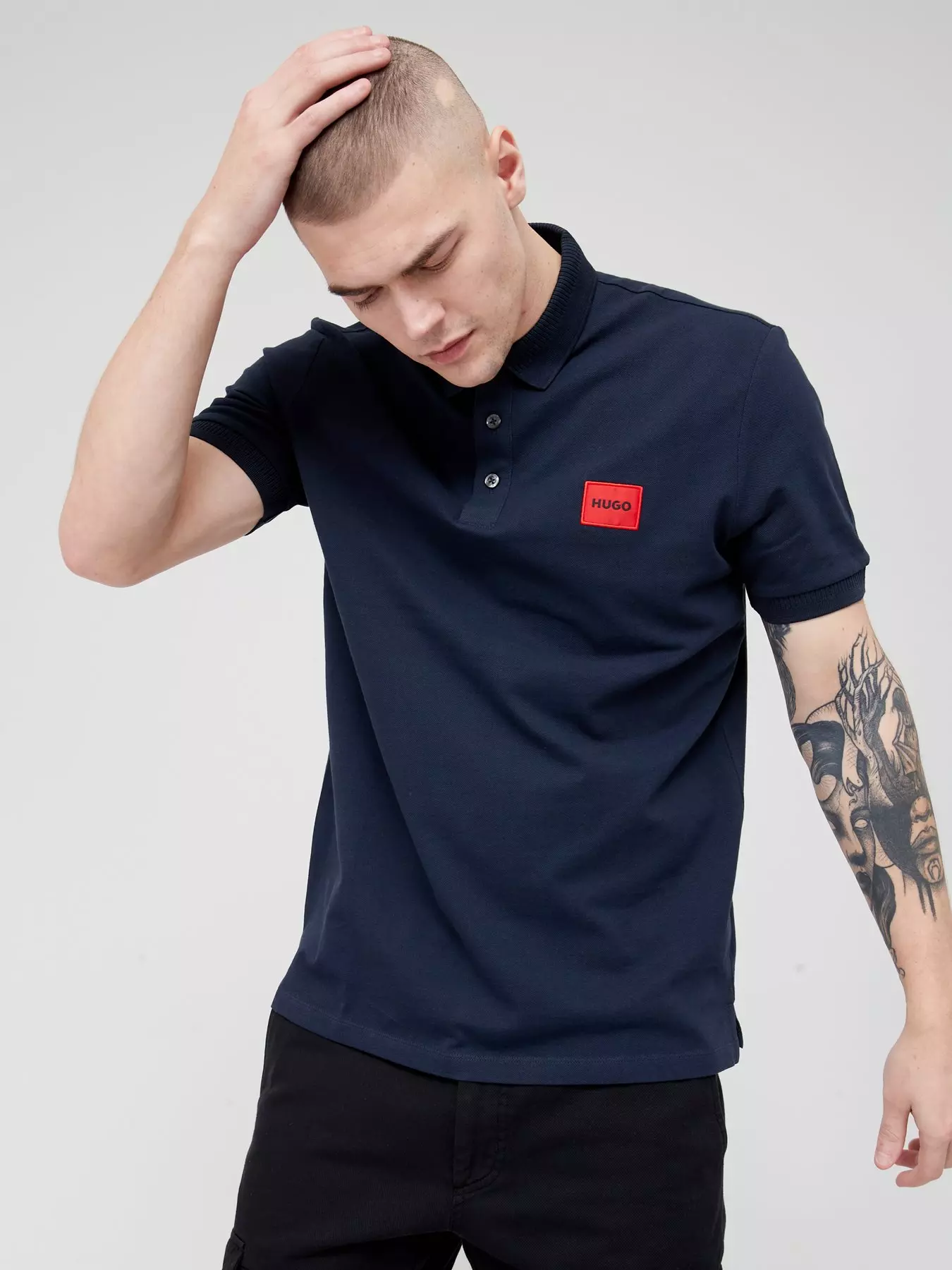 - Featuring tipping at the cuffs and collar, this polo shirt is cut to a defined fit and trimmed with a HUGO logo patch in signature red
