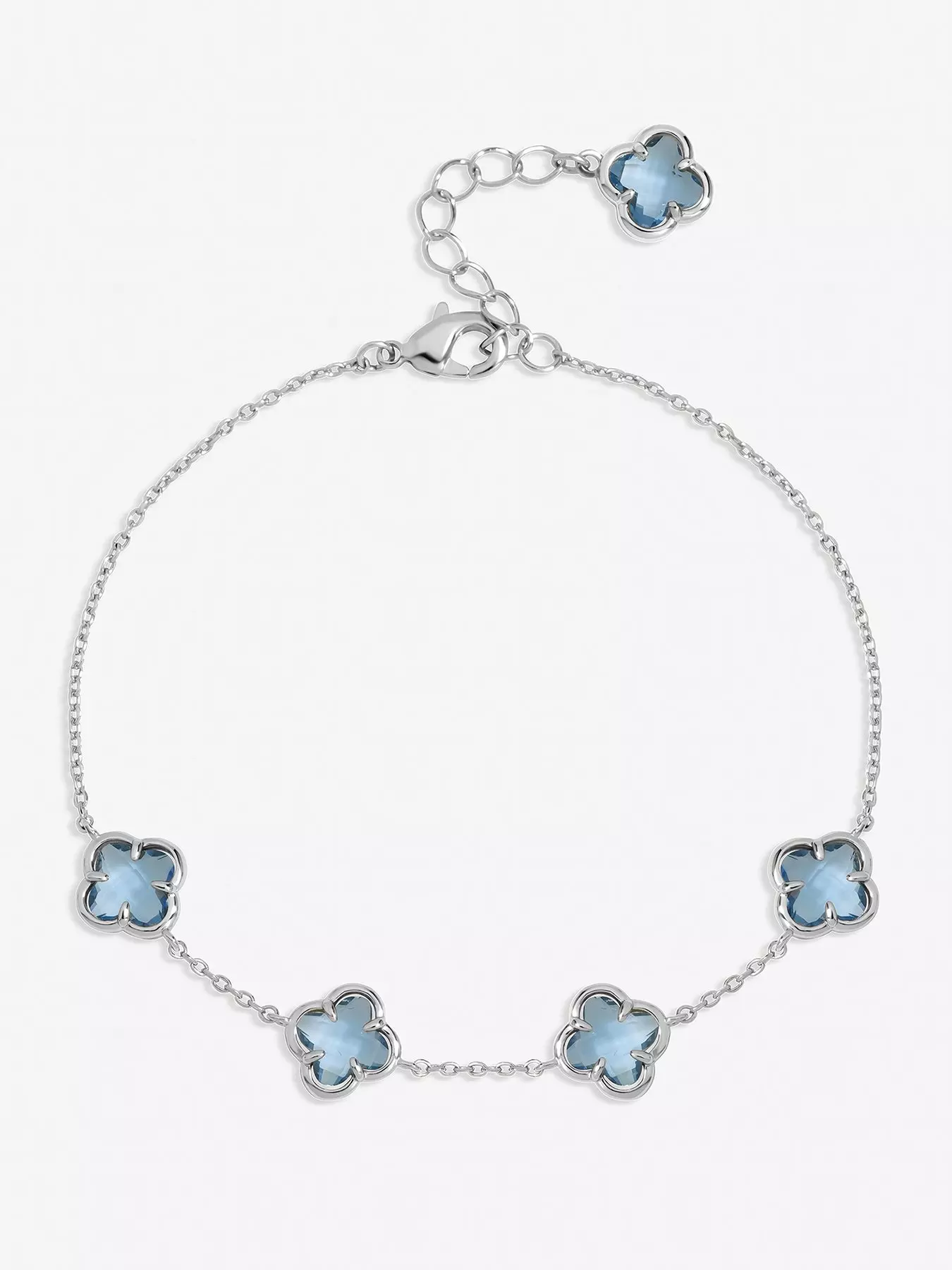 Our Inicio Light Sapphire Clover Bracelet offers a charming, delicate accent to your wrist. The design features a fine chain adorned with multiple clover-shaped stations, each set with a sparkling crystal stone. Crafted in polished sterling silver plating, this bracelet adds a touch of brilliance and lucky charm to any ensemble. It is perfect for both standalone wear and stacking with other bangles and cuffs. Fastening: Lobster clasp. Chain length: 7", extender length: 1". Width dimension: 10mm, length dimension: 10mm.Material: Sterling silver plated brass.- Depth: 10 MM