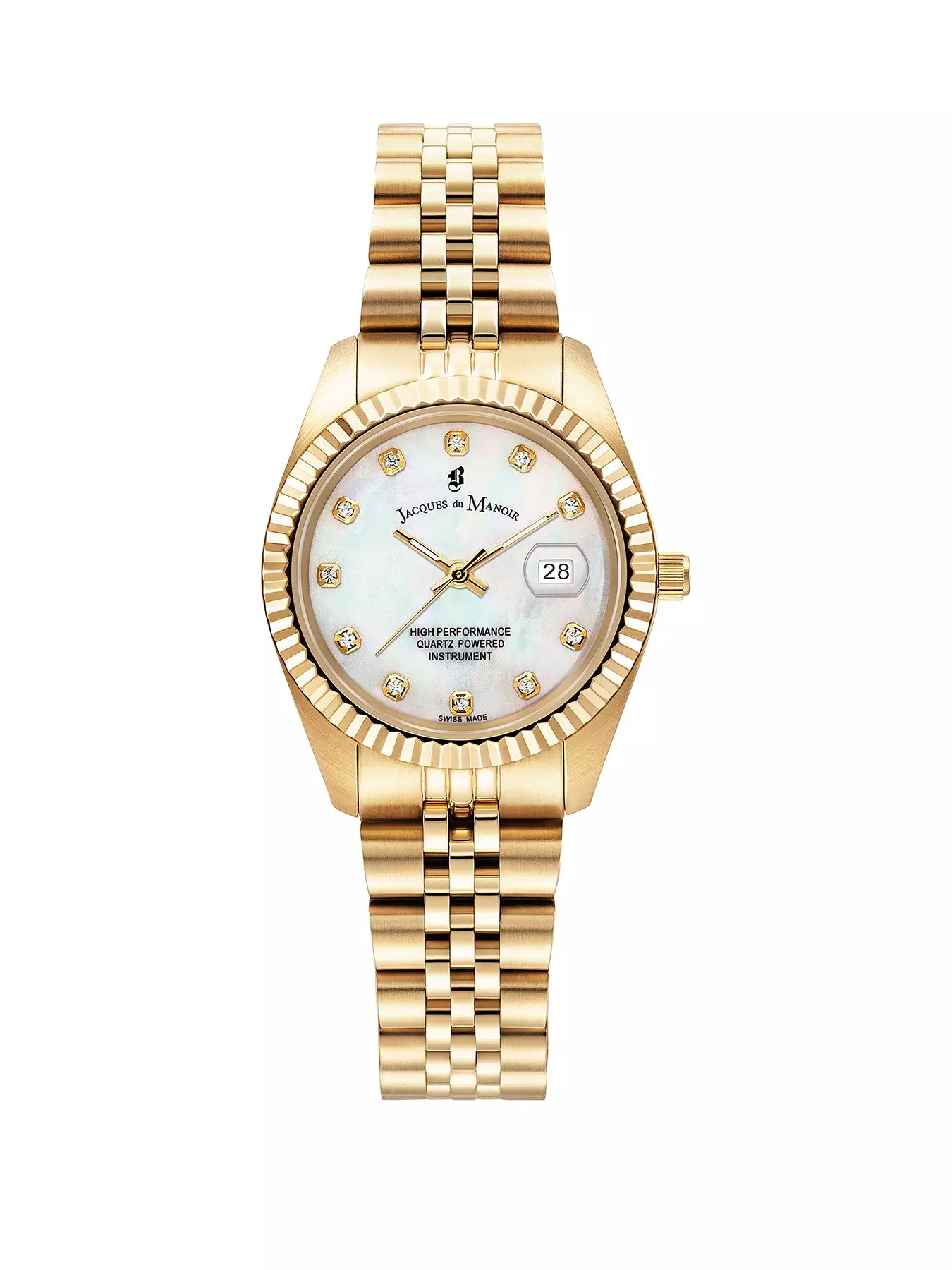 The INSPIRATION 31mm for today's modern woman is refreshingly different. Shimmering Gold IP metal in a firework of extraordinary combinations is the focal point of this fascinating ladies' watch from the current JACQUES DU MANOIR collection. From a distance, you could almost mistake the analogue metallic watch for a unisex model. A closer look, however, reveals the magical feminine charm of the white MOP stone set dial details in the INSPIRATION design. This watch will always grab people's attention and accentuate your outfit perfectly.- 24Hr Display: N