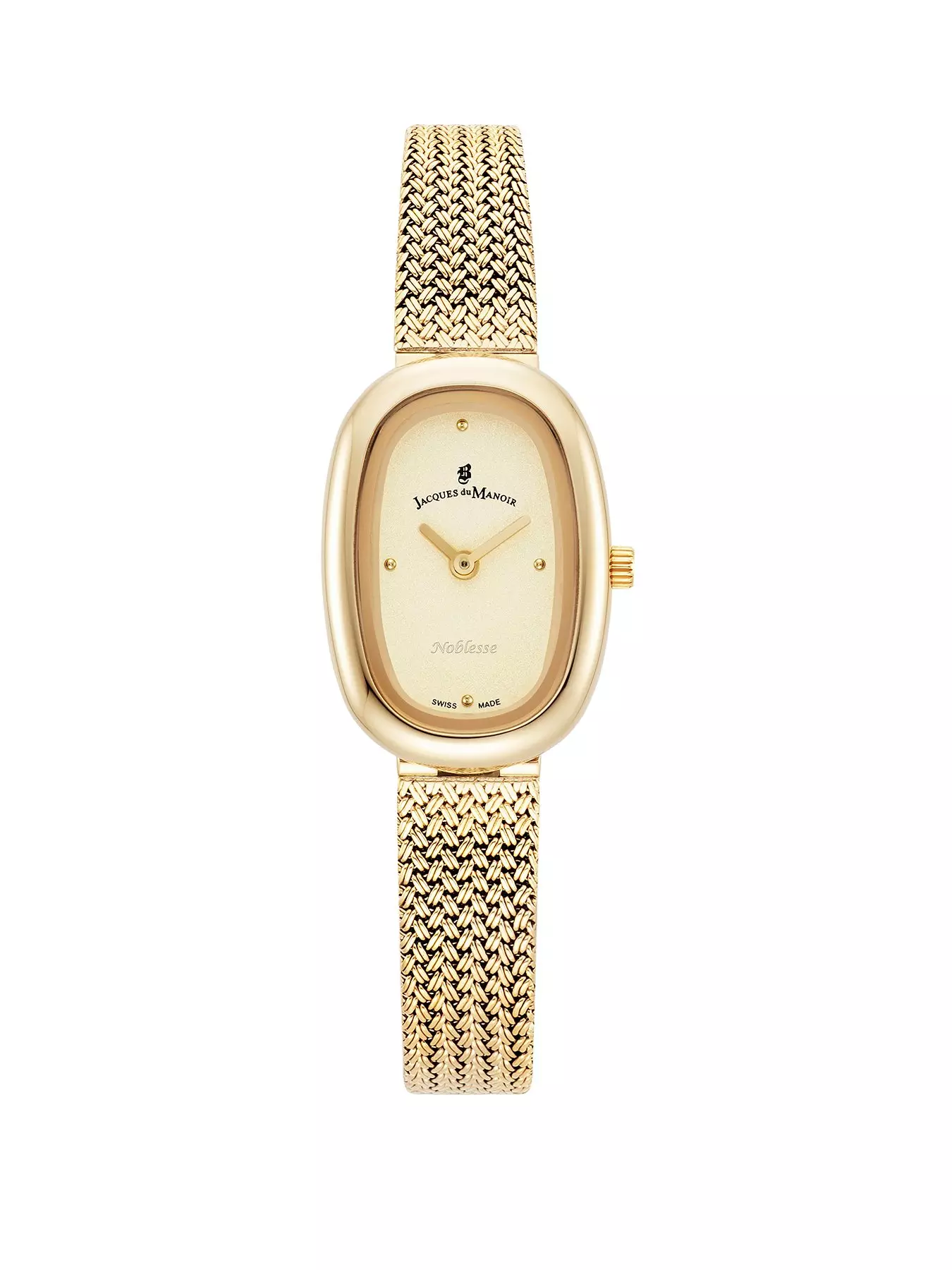 Noblesse - an elegant ellipse of timeless chic. An elegant ellipse uniquely forged in a single line, the Noblesse watch is the essence of Jacques du Manoir style: an unmatched marriage of purity and timeless chic. Inspired by French grace and Swiss precision, it turns everyday moments into quiet expressions of confidence and poise. Elegance refined by Swiss craftsmanship. Made in Mendrisio, Switzerland, this 20 Ã 28.5 mm gold-tone case follows the smooth geometry of the classic oval silhouette - radiant, feminine, and modern. Its minimalist two-hand dial floats over a brushed gold face, catching light like liquid metal while keeping the accuracy of Swiss quartz movement. The Noblesse collection pays tribute to French restraint - elegance that whispers. More than a watch, it's a statement of inner confidence: I know who I am.- 24Hr Display: N