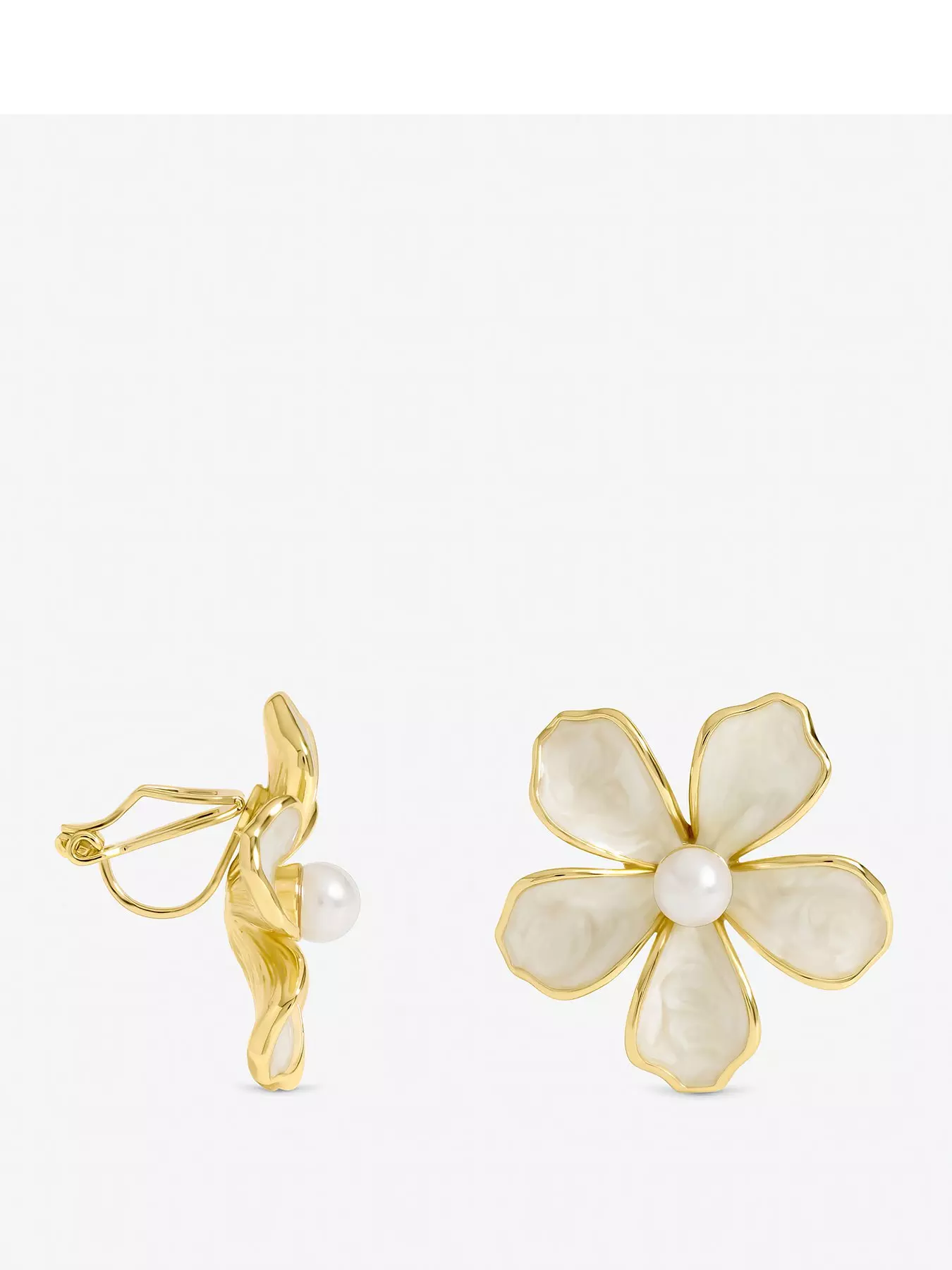 Our Jon Richard Gold Plated and White Enamel Flower Clip Earrings feature delicate flower motifs coated in pristine white enamel and set in polished gold plating. These earrings offer a timeless, elegant touch with a modern, feminine flair. Fastening: Clip on. Width dimension: 25.9mm, length dimension: 25.6mm. Material: Gold plated base metal.- Depth: 25.6 MM