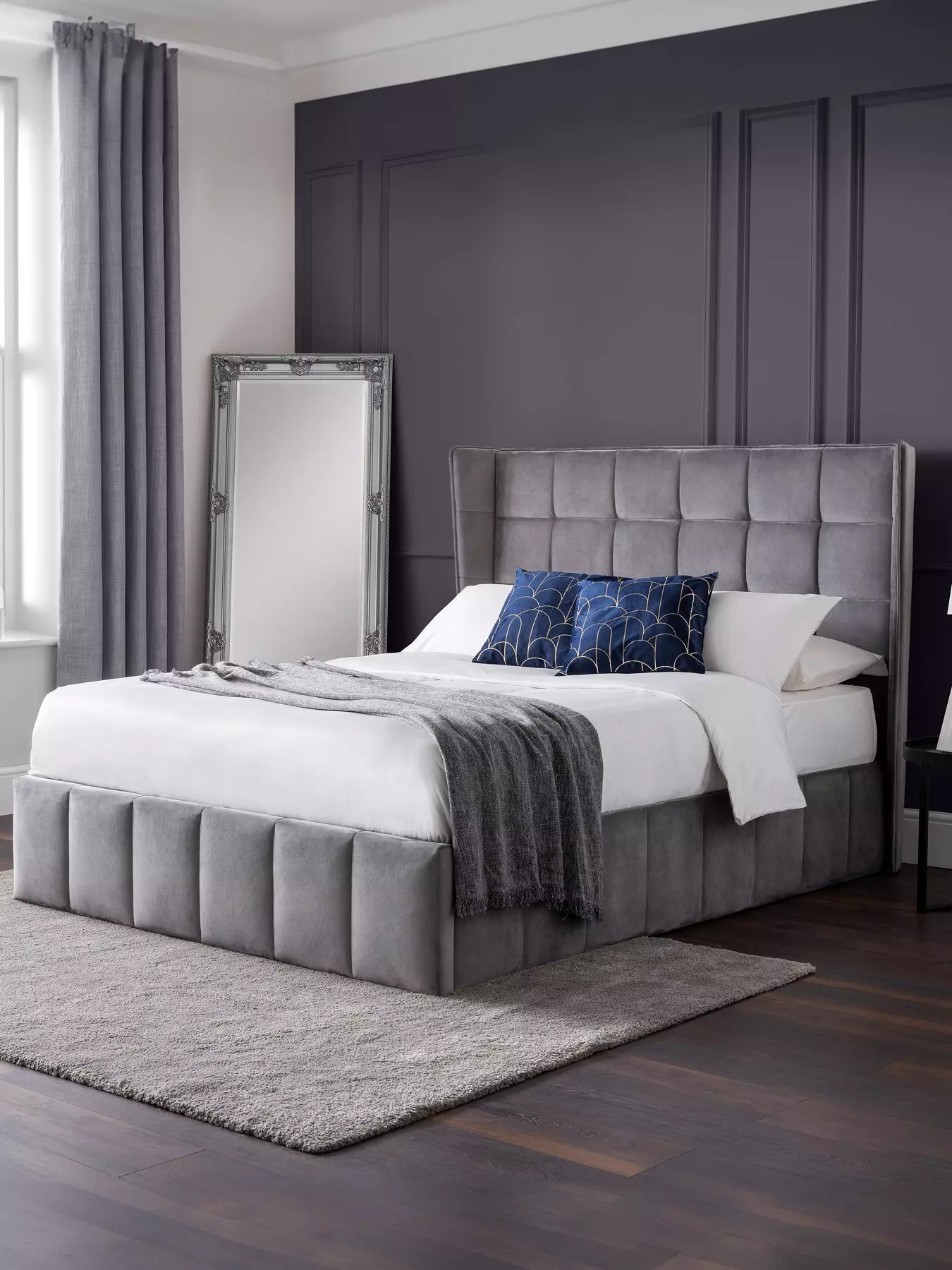 Inspired by elegant style and grace, the Gatsby bed features a beautiful, winged headboard. Finished in a gorgeous grey velvet, this bed is both aesthetically pleasing and provides a large amount of storage space too.The mattress base can be manually lifted with the help of the gas piston arms which keep it raised until you push it back down (see below for maximum mattress weights). This reveals a spacious storage area for spare bedding, pillows and more.