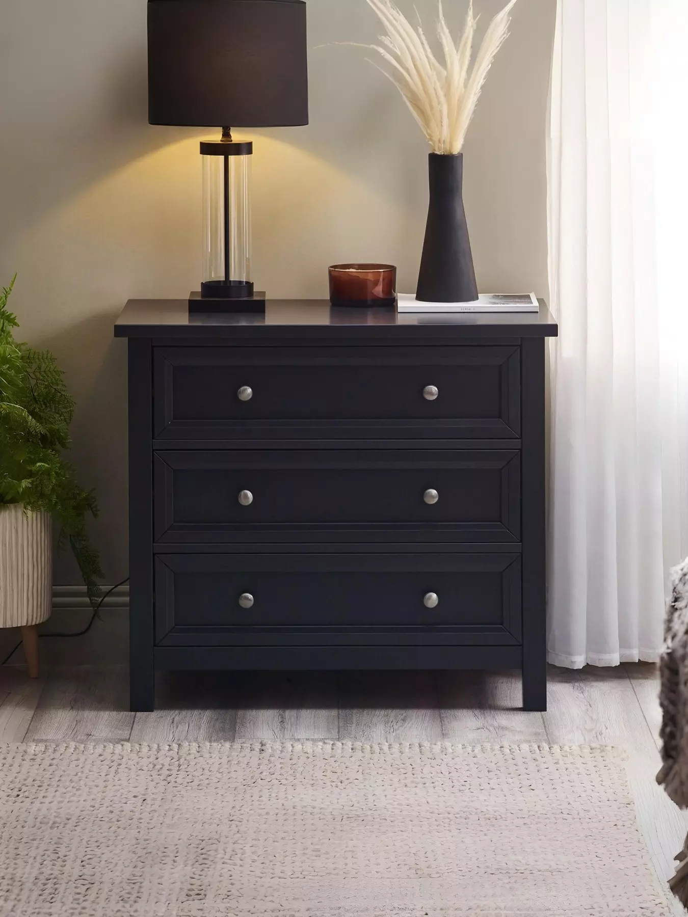Styled with a New England bedroom furniture inspiration, this chest of drawers from Julian Bowen's Maine collection comes in an elegant anthracite lacquered finish.This is a perfect way to highlight the side panelling, chamfered cabinetry and metal knob handles for a timeless appeal. 3 wide drawers create a roomy storage area that offers lots of space for all your folded faves, from underwear to tees.