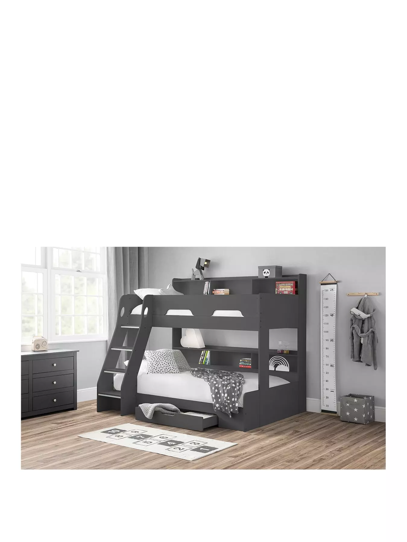 With enough room for three sleepy children, the Riley bunk bed by Jumian Bowen comes in a stylish anthracite colourway that will go with all sorts of bedding designs and room decors.The bunk includes a small double bed at the bottom and a single bed at the top, which are connected with an angled ladder that makes climbing up and down easy - especially when you fit the optional glow in the dark strips that help to light their way at night.