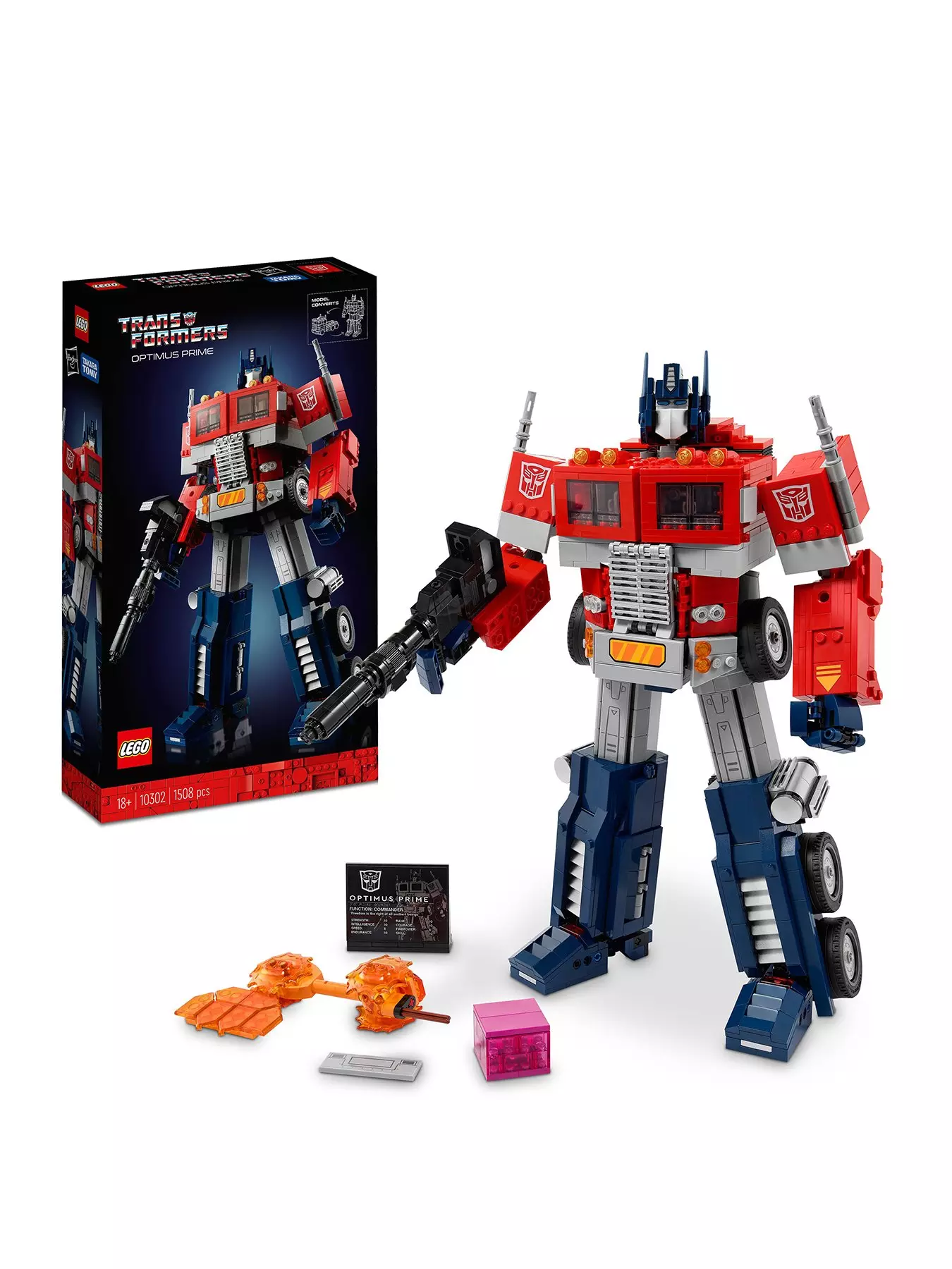Optimus Prime. Leader of the heroic Autobots. And now an impressive 2-in-1 LEGO build for Transformers fans. Awaken your passion for the Transformers universe with this LEGO Optimus Prime (10302) model building kit for adults as you craft all the details of an iconic robot.Just like the beloved original, this Optimus Prime Transformers figure converts from a robot to a truck model and back again. Admire the 19 points of articulation in robot mode and open the chest chamber to store the Autobot Matrix of Leadership. Attach the jetpack in robot mode and place the ion blaster and Energon axe in the Autobot’s hands. Other authentic accessories include an Energon cube and optional waist panel. Add the plaque to display your passion for Transformers with pride.
