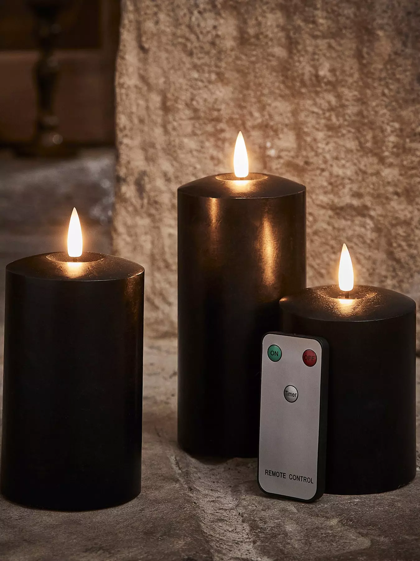 Invite an eerie yet elegant ambience into your home with this trio of black TruGlow pillar candles. At 15, 12.5 and 10cm in height, they're great for styling on your mantel or side tables for a spooky and stylish glow. Made from real wax and with a âjust lit' appearance, these realistic candles feature an LED flickering flame that will stay cool to the touch, for a super safe alternative to the real candles. Simply pop 2 x AA batteries into the base of each candle and use the optional 6 hour timer function for a haunting glow at the same time each night.- Depth: 7.5 CM