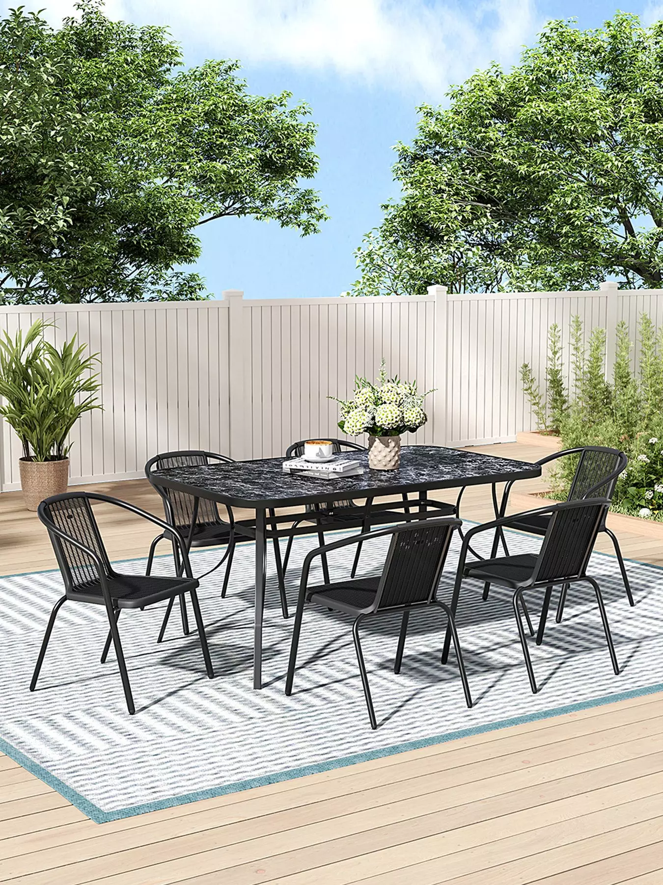 Living and HomeGarden Marble Pattern Table with 6 Rattan Stackable Chairs