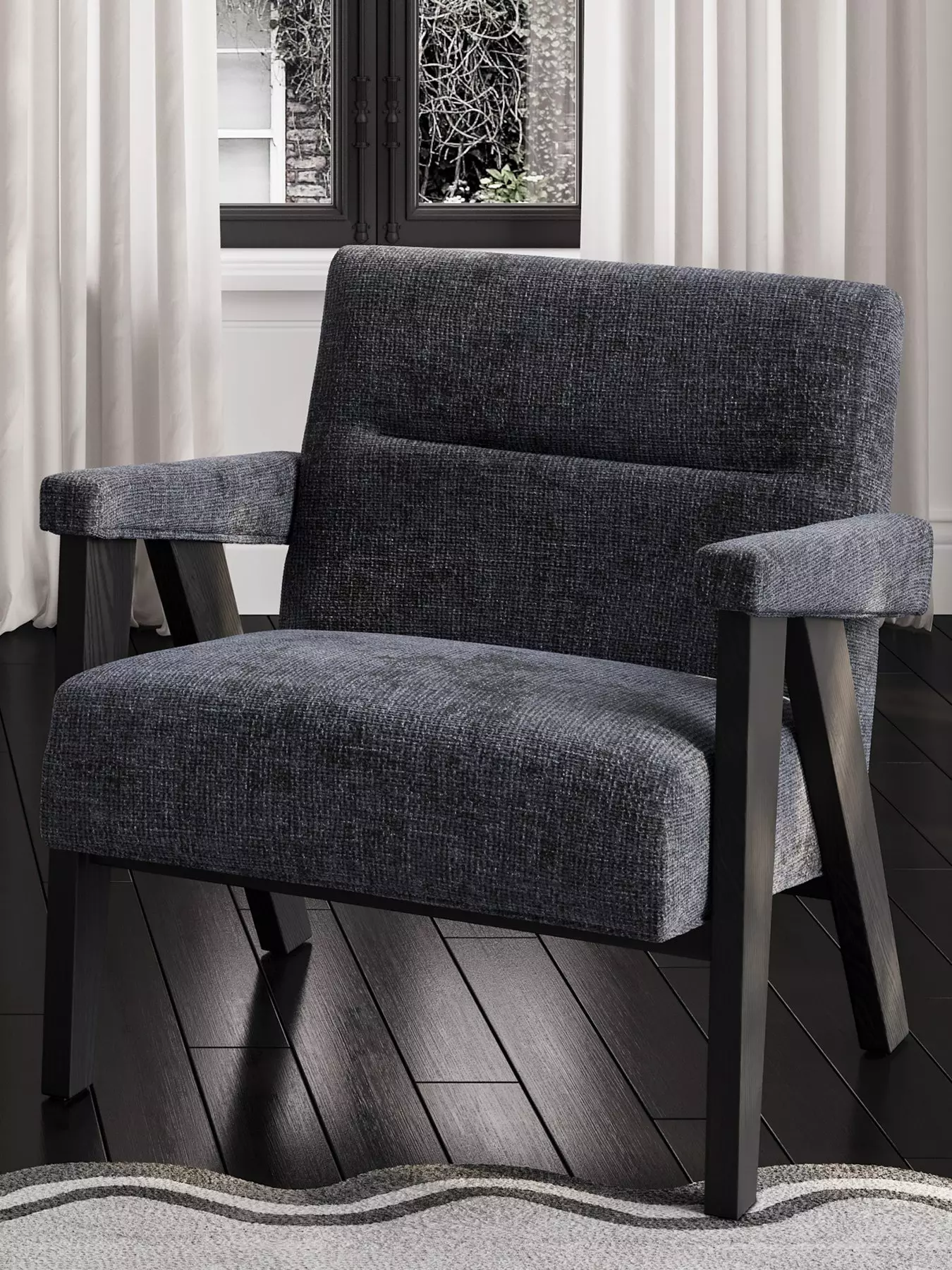 The Abel chair features luxurious Coal velvet tweed fabric paired with a contrasting Black frame. Designed for comfort, it includes padded armrests and a cushioned seat. Available in two colorways, it looks stunning on its own or as a pair around a table.- Assembly: Self Assembly
