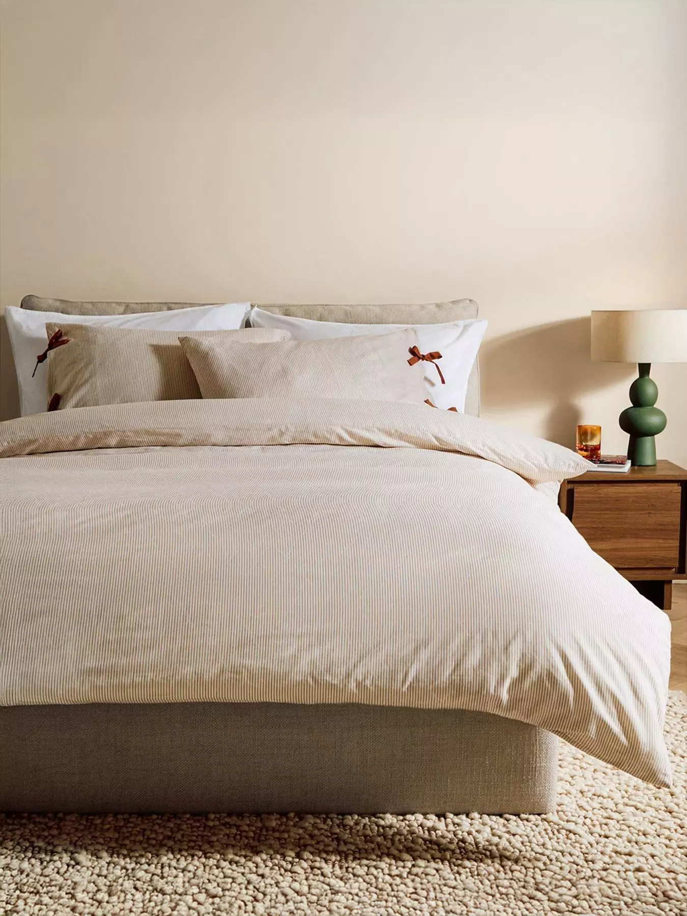 Transform your bedroom into a serene retreat with the Ansel Duvet Cover Set. Made from 100% breathable cotton with a soft 144-thread count front, it delivers effortless comfort and elegance. The double-sided pinstripe design allows for versatile styling, while the contrast bow-tie accents on the pillowcases introduce a subtle yet chic twist.- Depth: 10 MM