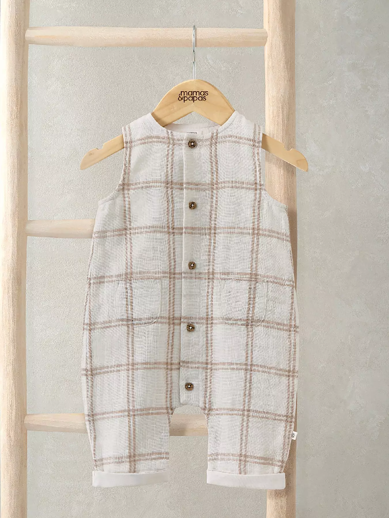 Soft and stylish, this unisex cream woven check romper is a comfortable choice for everyday. Made from 100% cotton with a fully lined jersey interior, it features a relaxed sleeveless design, mock wood button fastenings at the front, and concealed poppers at the gusset and legs for easy changing. Finished with front patch pockets, turn-back leg cuffs and a woven tab detail at the side seam, it combines practicality with laid-back style.- Material Content: 100% Cotton