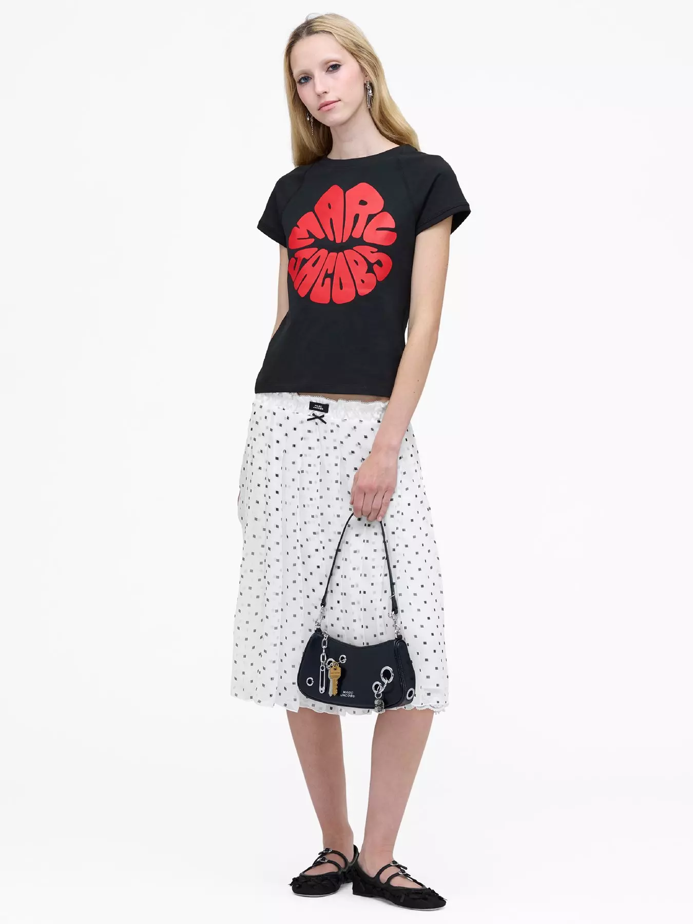 - A shrunken tee featuring a Marc Jacobs kiss printed graphic. Hits at the natural waist with a woven logo on the back.
