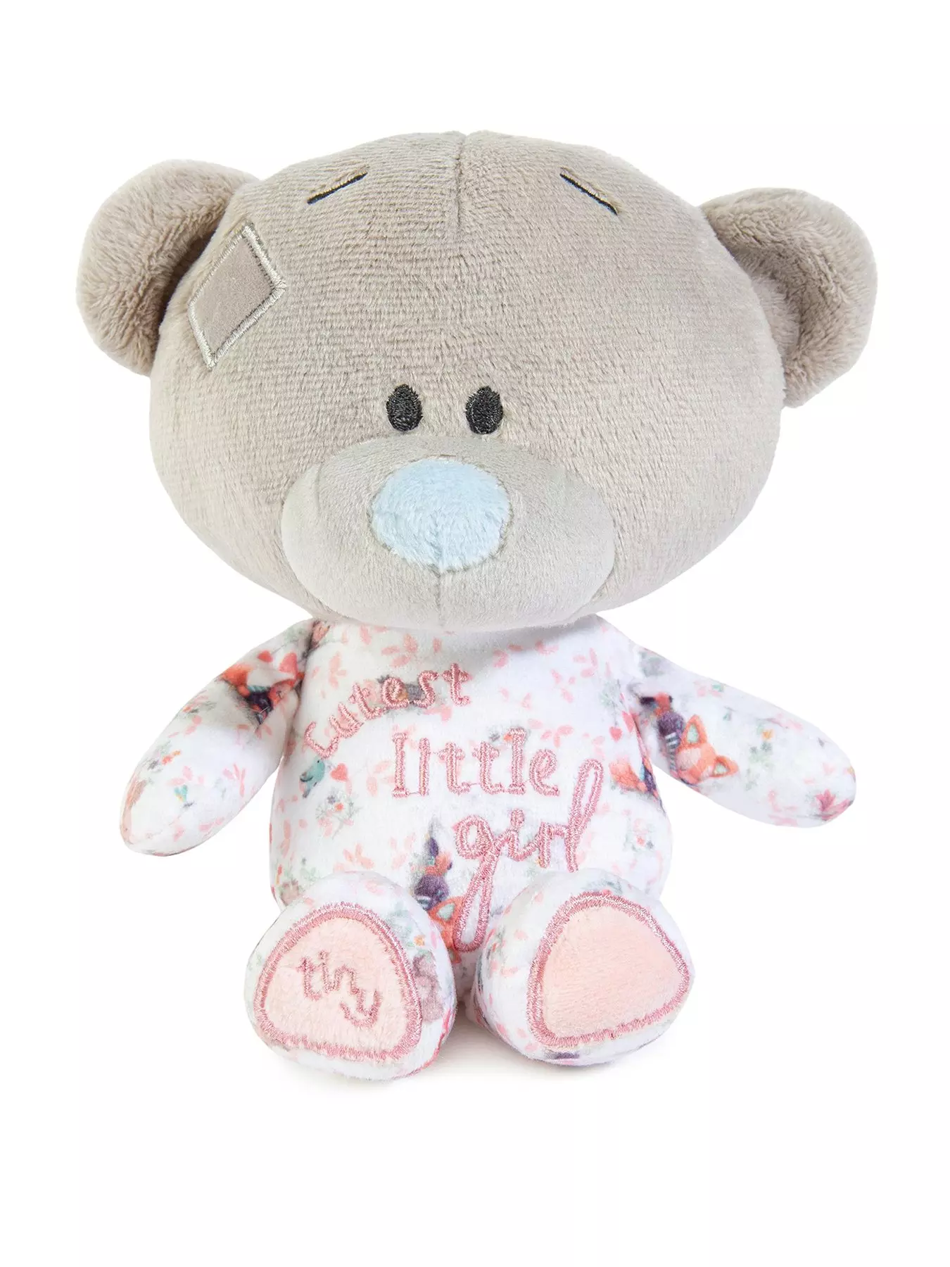 Welcome a little baby girl to the world with this adorable Tiny Tatty Teddy plush bear. Super-soft and baby safe from birth, this cute bear is wearing a sleepsuit illustrated with a sweet woodland-themed print. Crafted in soft shades of pink, cream and grey, with a cute blue nose, this is a lovely new baby gift that's sure to be treasured. Embroidered on the front of the bear is the caption 'Cutest little girl' - it's a gorgeous thoughtful gift to celebrate the new arrival! This Tiny Tatty Teddy sits 15cm high, a lovely size for the nursery or playroom.- Recipient: For Her