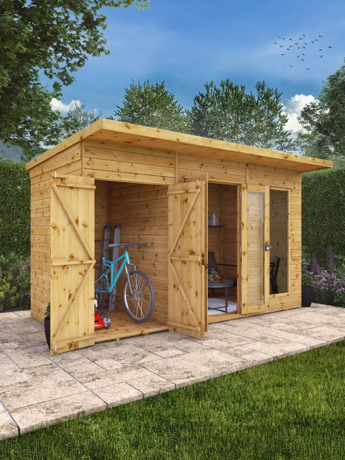 Get the best of both worlds with our 12ft x 6ft Maine Pent Summerhouse with Side Shed. This stylish summerhouse is the perfect solution for those seeking dedicated areas for both relaxation and storage. As the handy side shed is ideal for hiding away any garden essentials you don't want in your summerhouse!The interior of the Maine Pent Summerhouse is bright and airy, thanks to the large double french doors. Creating a garden room that can be used for everything, from a cup of tea with friends to a cosy craft room. All you need is just a few simple additions.