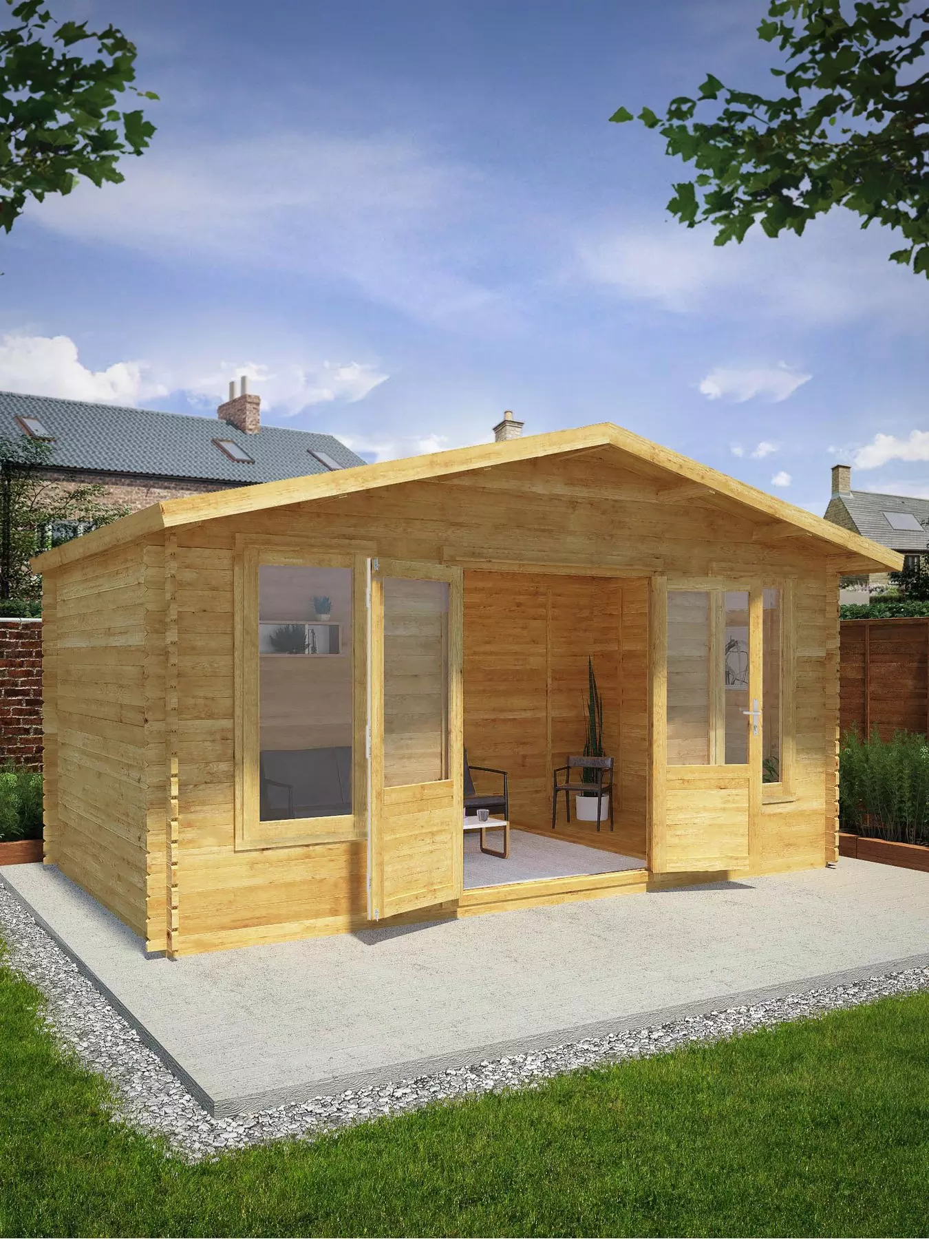 Stylish and Elegant Garden AdditionIts large, open-plan design makes it an excellent choice for adding living or entertaining space to your home. The extended roof overhang provides a sheltered area for outdoor seating. The cabin features two large windows and half-glazed double doors, offering a bright and airy interior. The overhang roof allows for natural shade and weather protection, so you can keep the doors open even during a British summer.