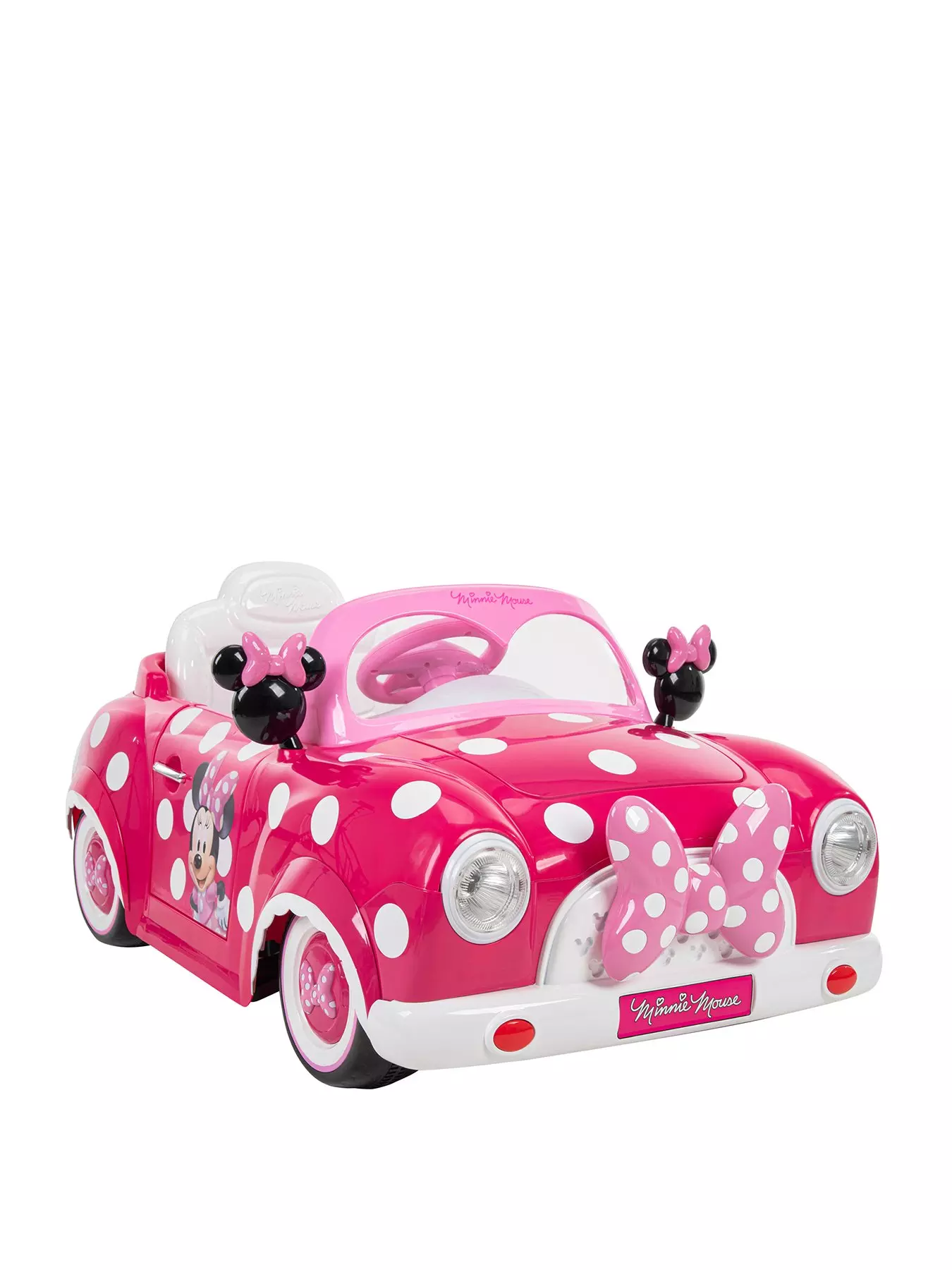It's love at first sight when your little one spots the adorable big bow on the Minnie Mouse Convertible! But the fun doesn't stop there - this Minnie Mouse battery-powered ride-on car lights up and makes sounds for a super realistic driving experience! Huffy has made sure assembly is a breeze, so you can get it ready in no time and start creating magical memories.In just a few quick steps, you're ready to roll! Snap on the wheels, plug in the battery, add the seat and windshield, attach the mirrors, and you're good to go. This durable kids' car features the full Minnie Mouse look and a realistic instrument panel for an exciting ride. It’s easy and fun to drive forward and backward, with speeds up to 4 km/h.