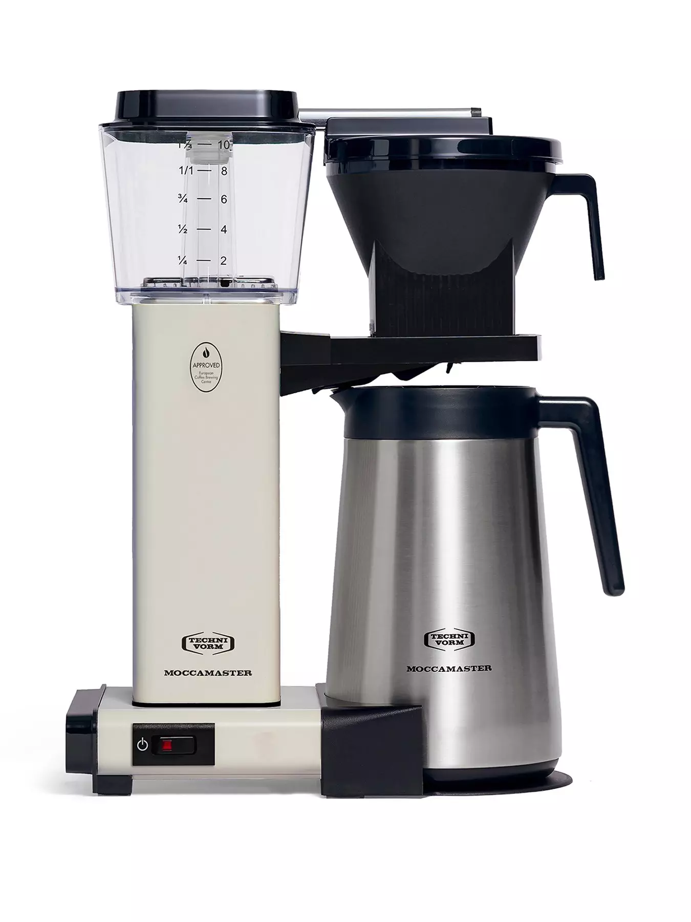 CERTIFIED BY ECBC AND SCA Technivorm Moccamaster works closely together with leading international coffee research centres such as the European Coffee Brewing Centre and the Speciality Coffee Association. The 10-cup coffee (1.25 L) is brewed quiet and fast in 5-6 minutes with Auto-Safety Shut-Off (AO) safety feature. Compatible with 1 x 4 filters.