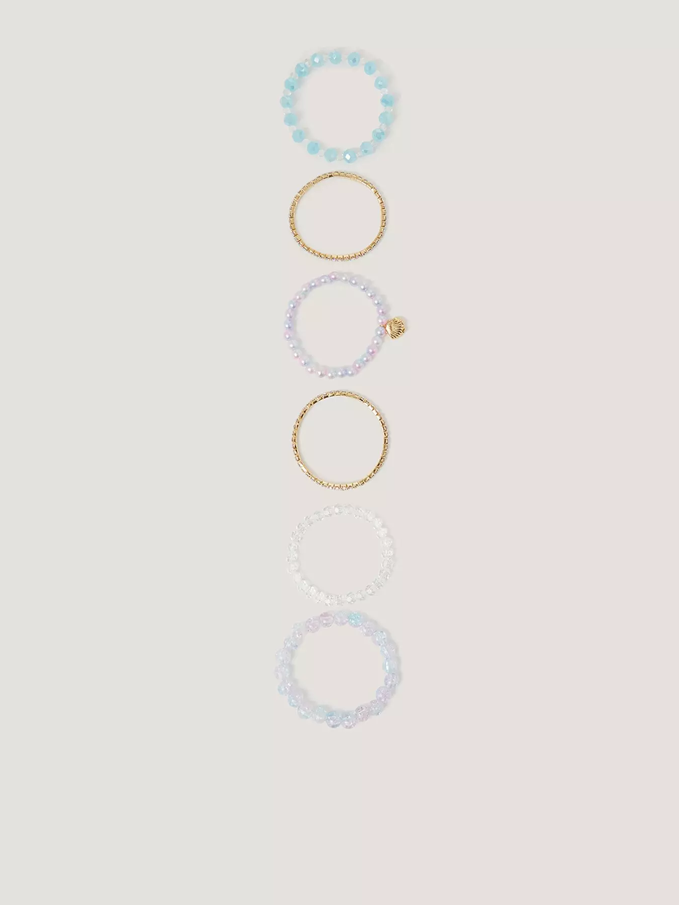 Alexa, play Under The Sea. Jewellery that Ariel would totally approve of, these bracelets are made for the beach babes. Strung with a mix of shimmery beads, rhinestones and shell charms. Six included. Warning! Choking Hazard. Small parts. Not suitable for- Material Content: Elastane 2%, Iron 28%, Plastic 70%