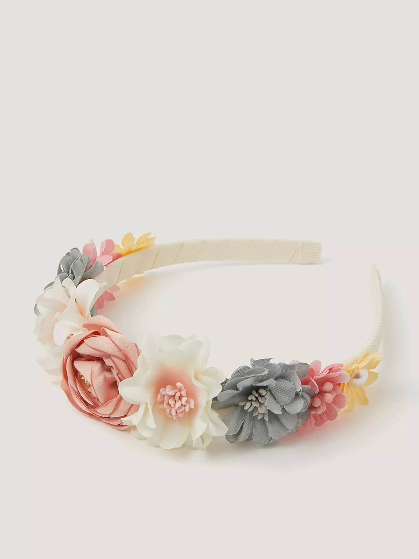 Fairy princess vibes. Adding a whimsical touch to their party and occasion looks, this headband is wrapped in ivory ribbon with a bouquet of fabric flowers decorating the top.Warning! Choking Hazard. Small parts. Not suitable for children under 3 years ol- Material Content: Plastic 50%, Polyester 50%