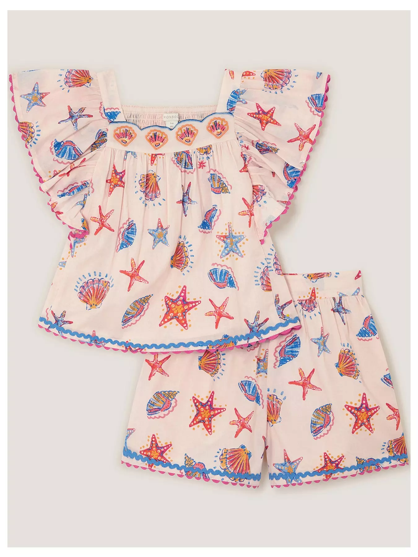 She wears seashells! A co-ord for the beach babes, this set includes a frill-sleeved top and matching shorts, both patterned with artsy shells and starfish motifs. Cute, right?- Material Content: Lining: Cotton (b) 100%, Shell: Cotton (b) 100%