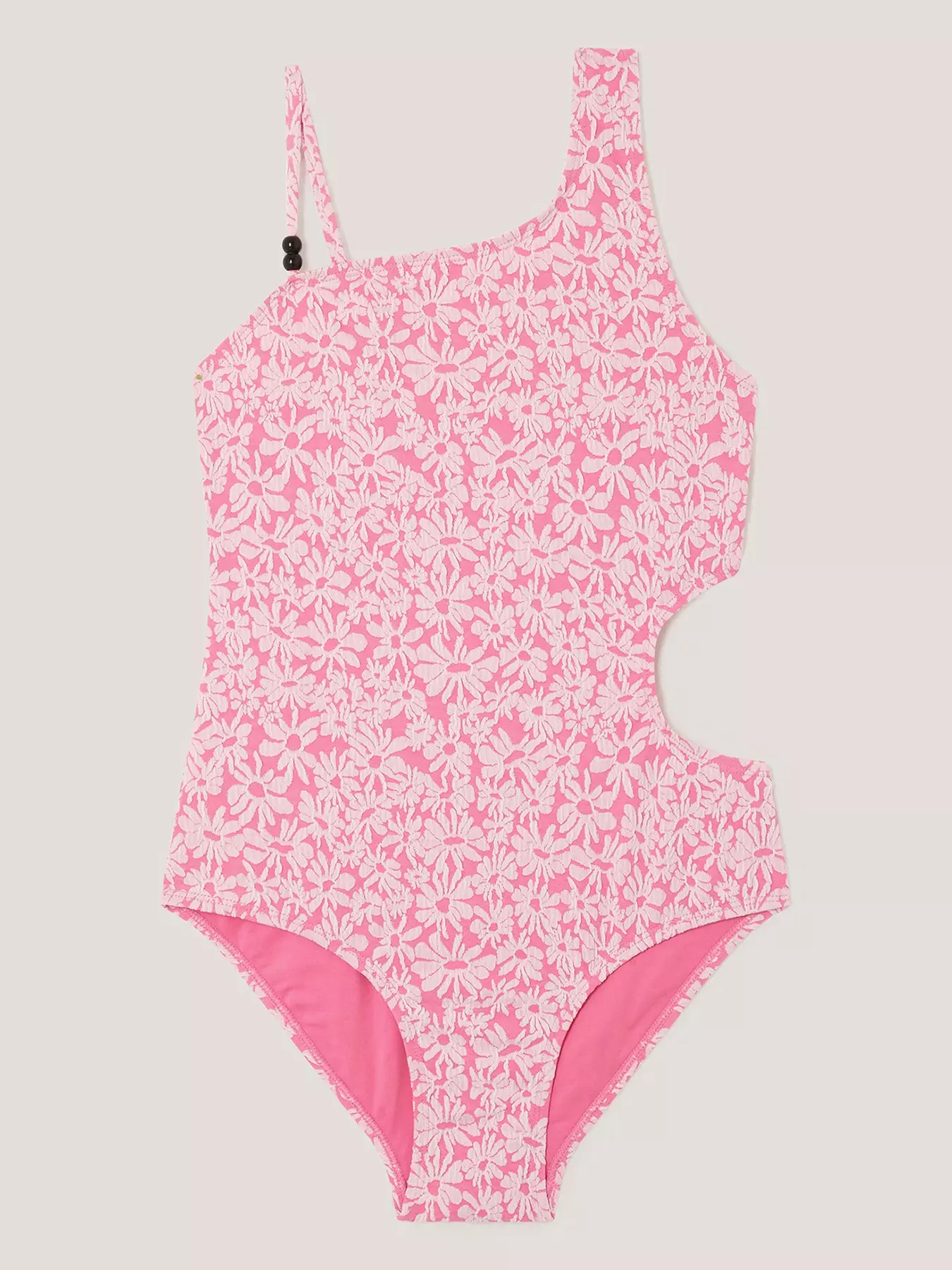 Suitcase essential! Gorgeously girly and packed with floral fun, this swimsuit is ready for all their water adventures. Designed with asymmetrical straps and a cut-out waist. Please note that this product can only be returned with the hygiene seal still in place.- Material Content: Outer: Elastane 14%, Polyamide 57%, Polyester 29%, Lining: Elastane 8%, Polyester 92%