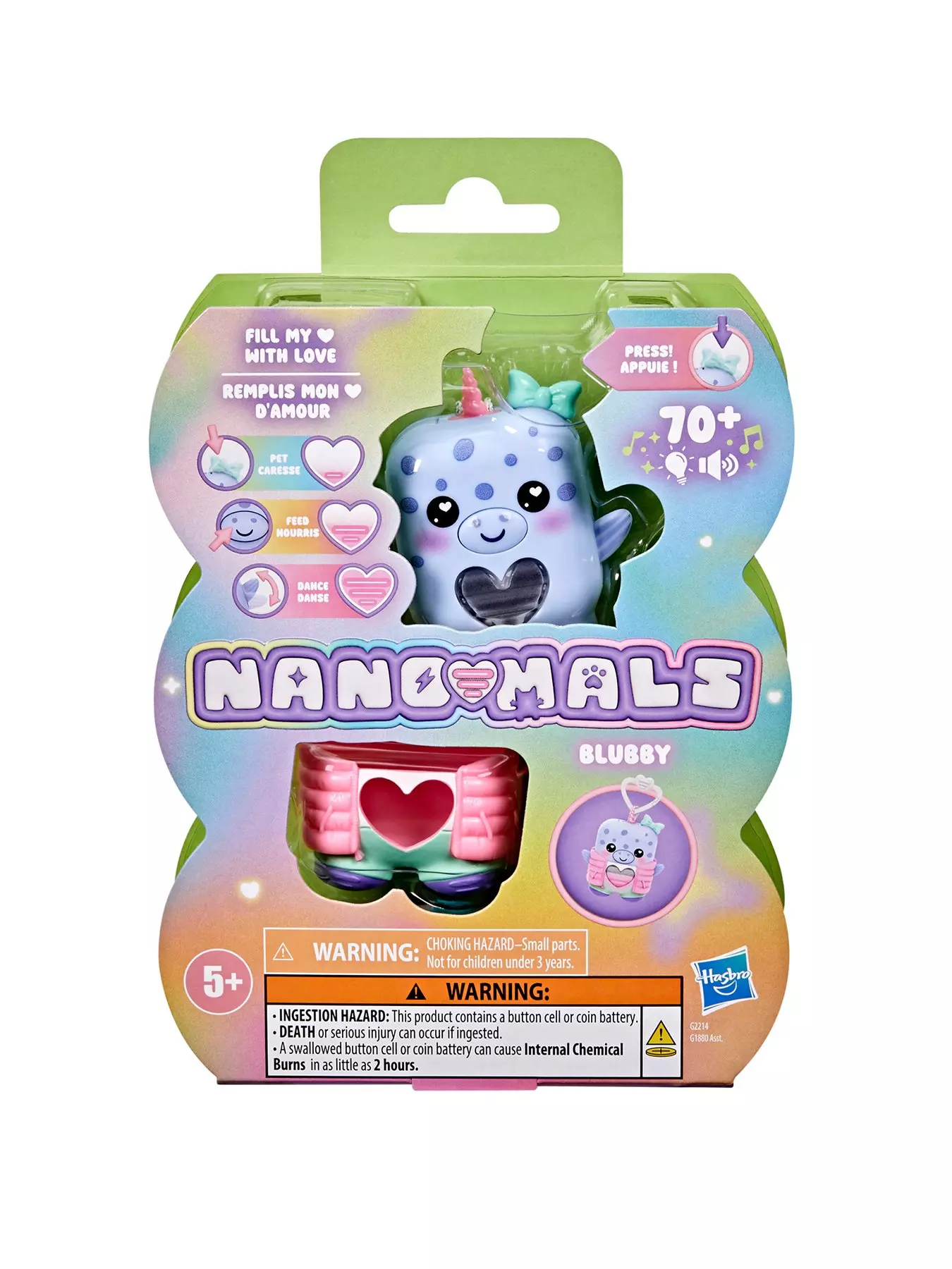 Unlock a world of fidgety, fashionable pocket-sized pets with Nano-mals Blubby the narwhal. Nano-mals are electronic fidget toys and adorable mini companions that need your love! Each Nano-mals character has a colour-changing heart meter that children can fill in so many fun and satisfying ways. When Blubby's heart meter drops, she'll make sounds to let you know she needs care. If her heart meter is blue, she needs pets, so press her bow. If her heart is orange, she's hungry - press her mouth to pretend feed her. Is her heart pink? Click her arms up and down to make her dance. What about purple? She wants to move! Flip, catch or shake to fill her heart. Blubby will celebrate her full heart with a song and colourful lights show. Give Blubby some extra flair with a textured snap-on puffer vest outfit. Plus, she comes with an attached clip, so she makes a great kids keychain. Nano-mals are the perfect present for children who love animal toys, digital pets and fidget toys. Nano-mals and Hasbro and all related trademarks and logos are trademarks of Hasbro, Inc.- Accessory List: Includes: Nano-mals character and outfit.