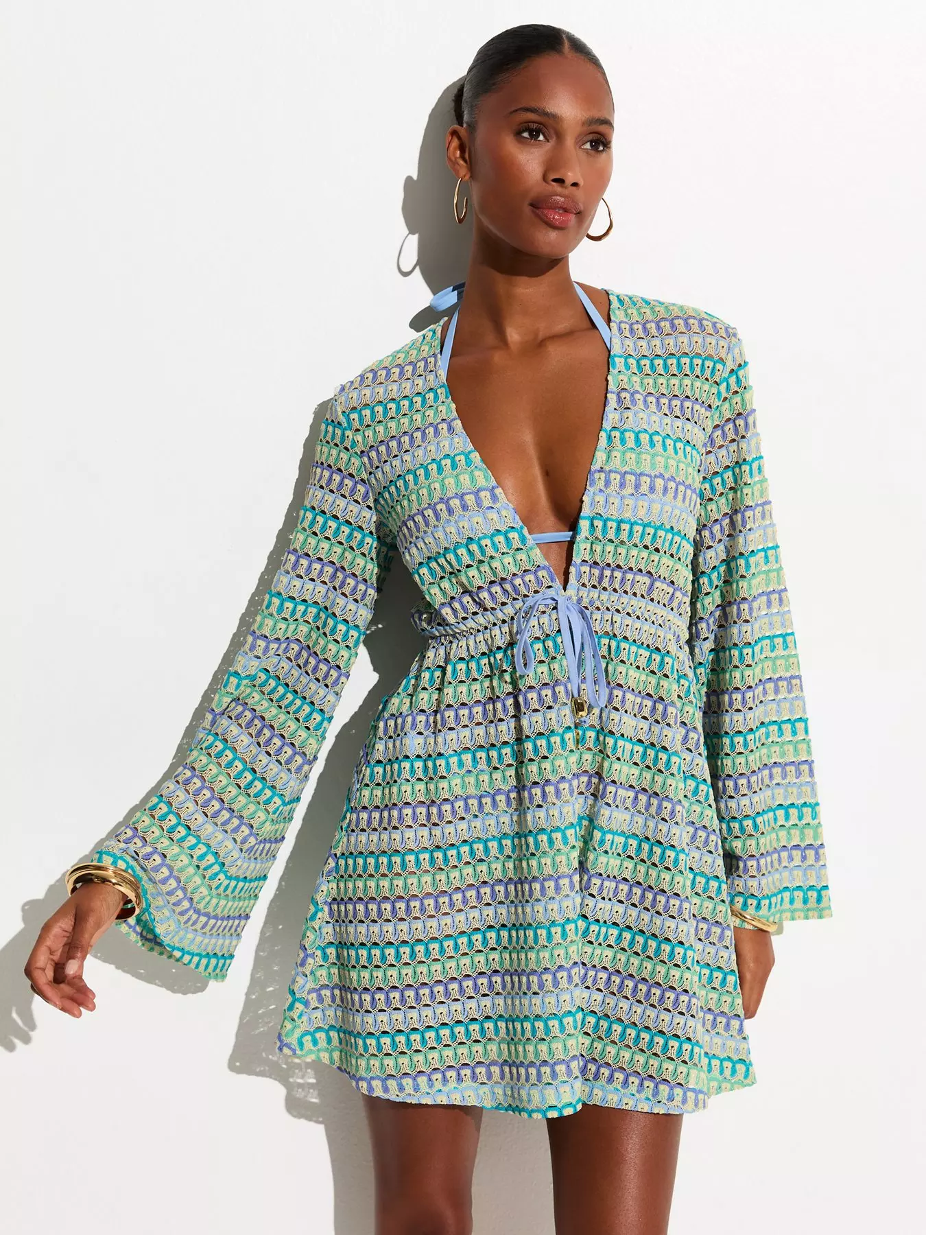 New LookBlue Crochet Flared Sleeve Kaftan Beach Dress