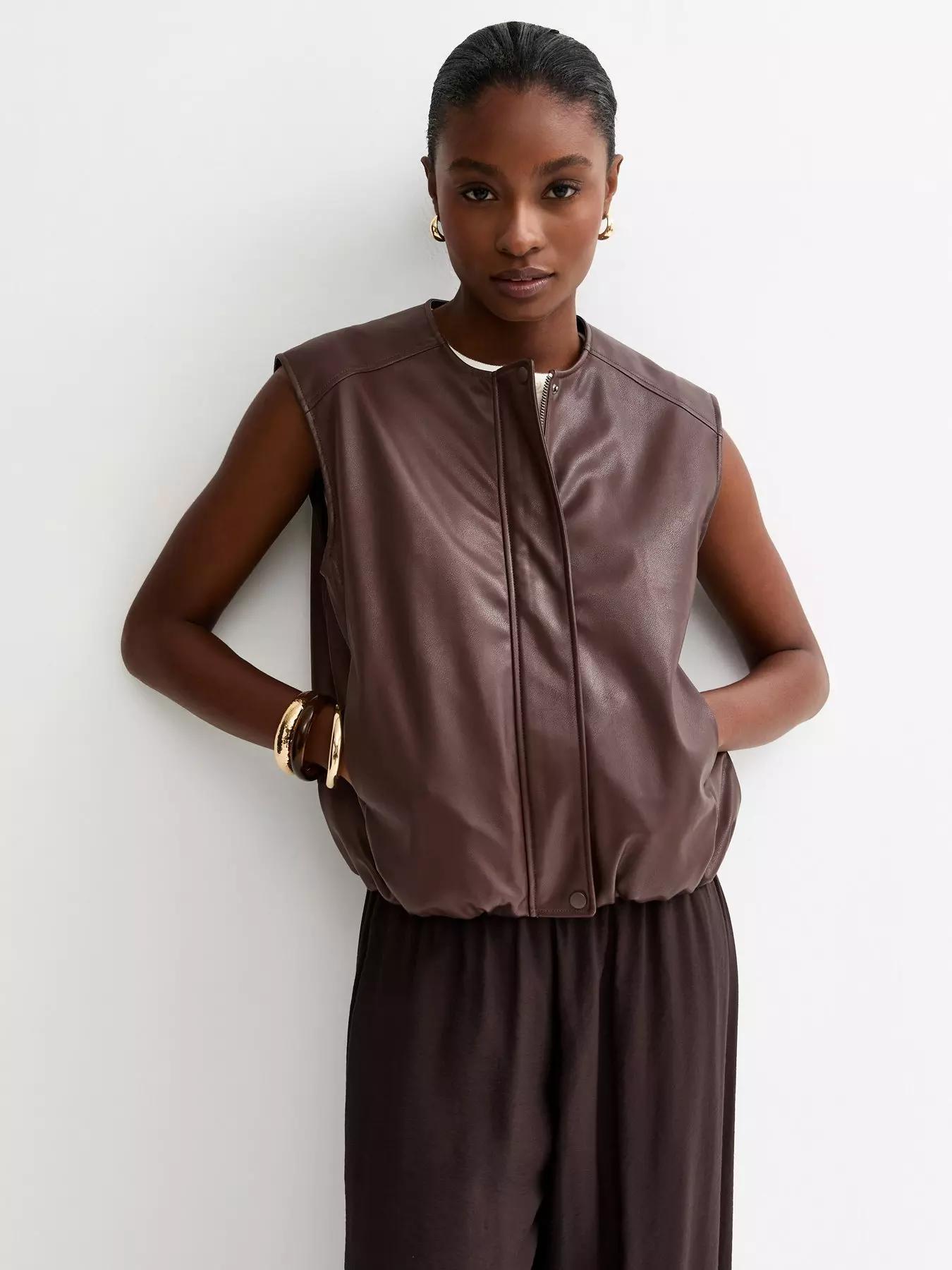 New Look Brown Faux Leather Sleeveless Bubble Hem Jacket