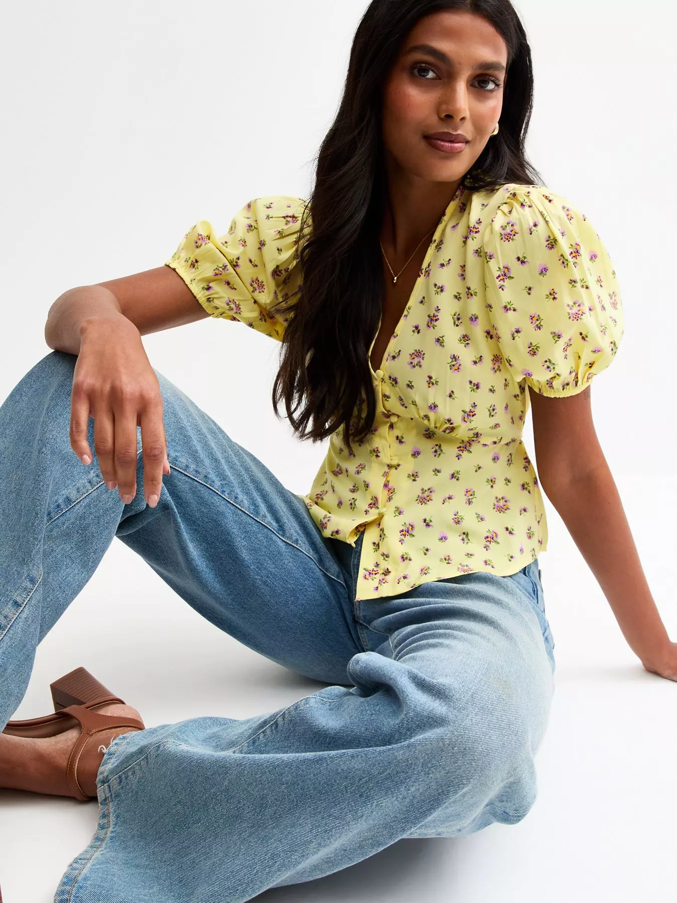 New LookCrepe Ditsy Print Button Front Milkmaid Top - Yellow